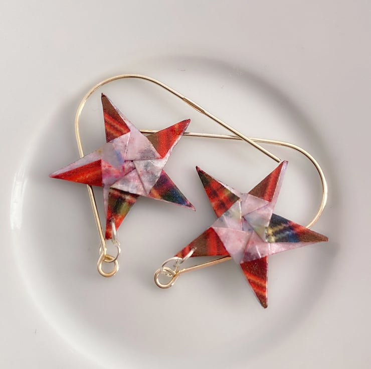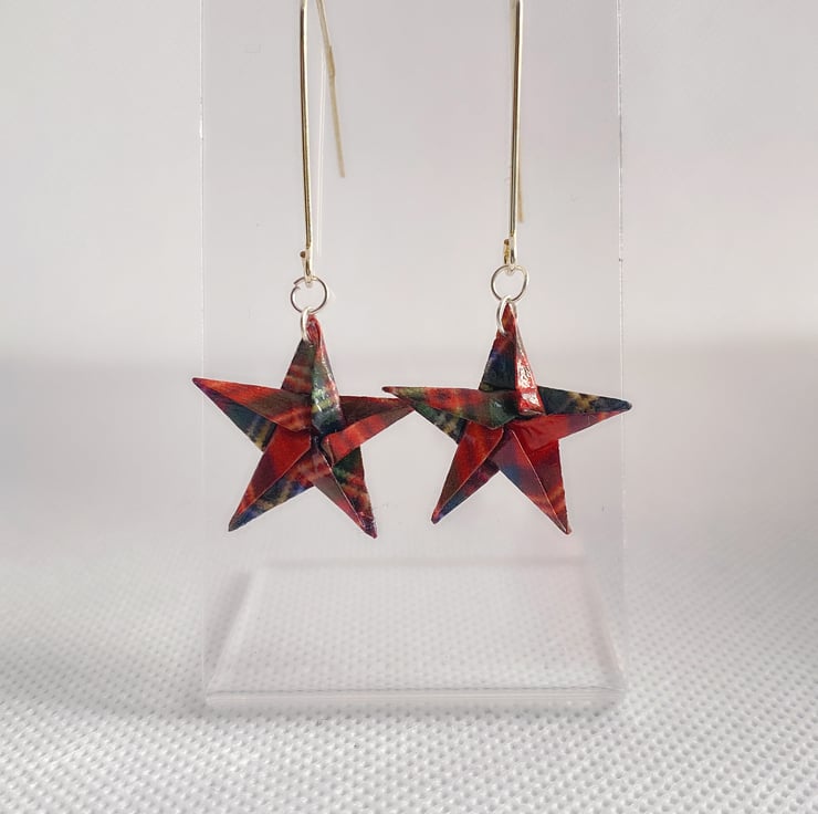 Add a touch of whimsy and charm to your outfit with these Handmade Origami Star Dangle Earrings. These earrings feature a striking Red Plaid Pattern, inspired by traditional Grid Tartan designs. The intricate folds of the origami stars create a unique visual texture, while the silver hooks add a contemporary finish. Whether you're attending a special event or looking to elevate your everyday look, these earrings are the perfect accessory to showcase your individuality.