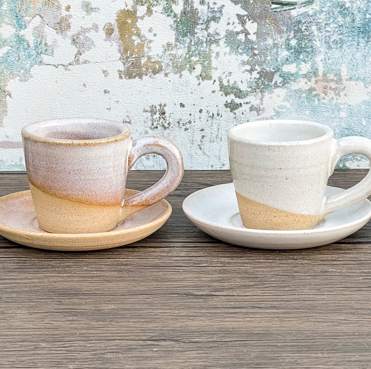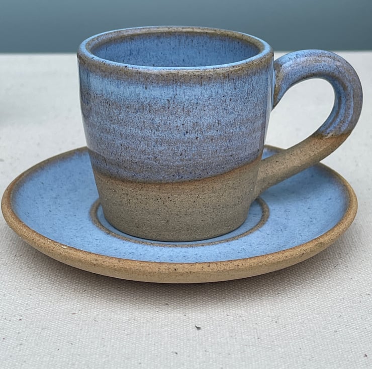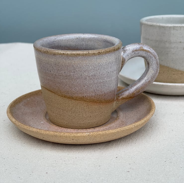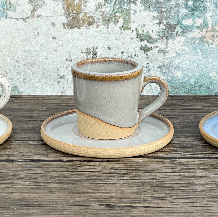 Mostly glazed stoneware clay espresso cup and saucer set in a range of beautiful, understated colours, and with a choice of flat or rounded saucer. These are thrown on the pottery wheel, with a pulled handle and a thrown saucer, all made from start to finish in my own studio and glazed with my unique glazes.