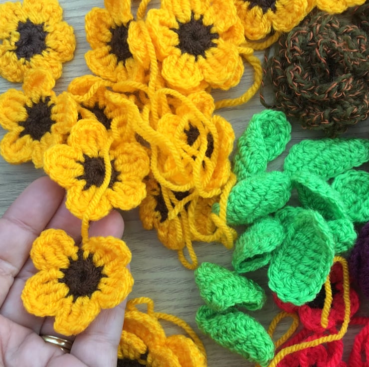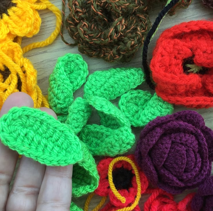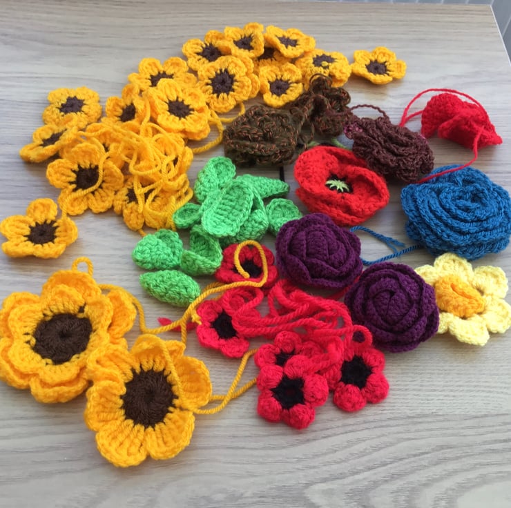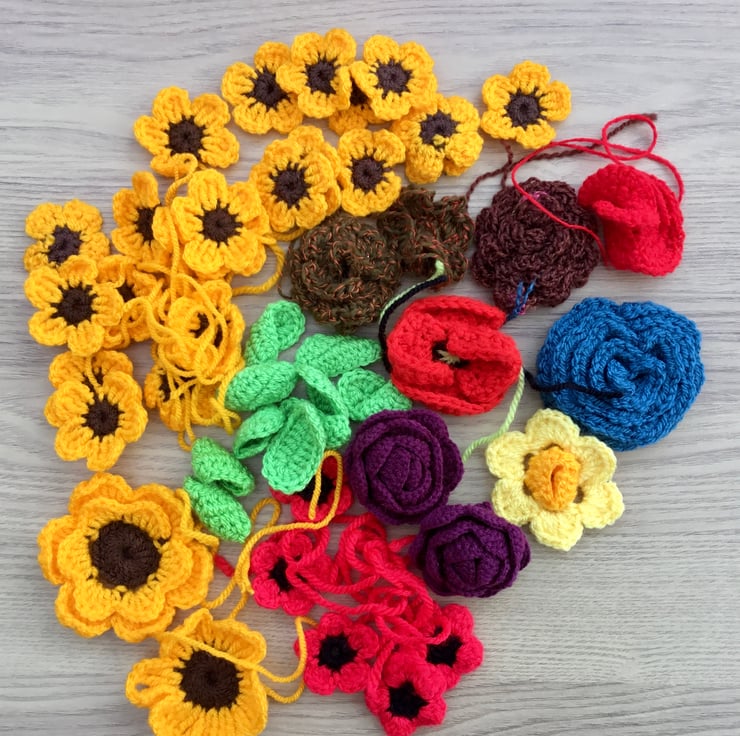 Each flower or leaf is hand crocheted, and included structured roses, daisies, poppies, sunflowers, daffodil, so multiple crafting items.