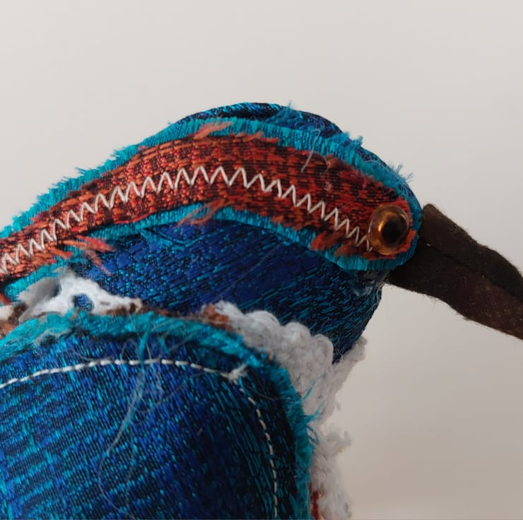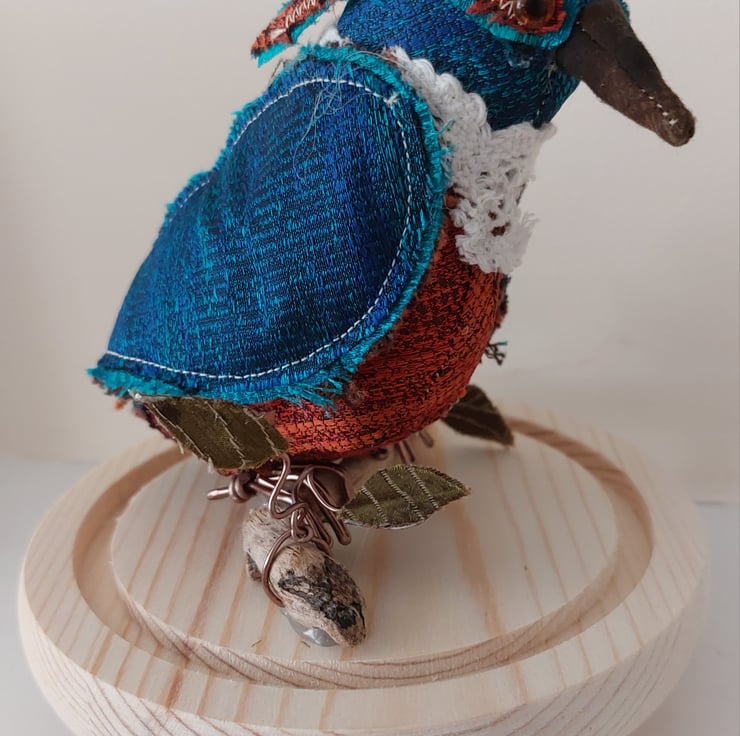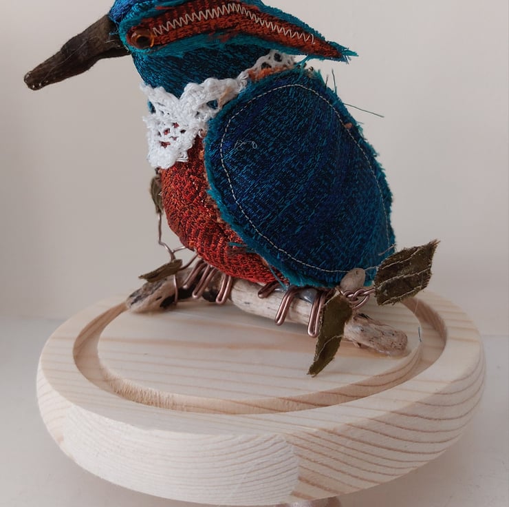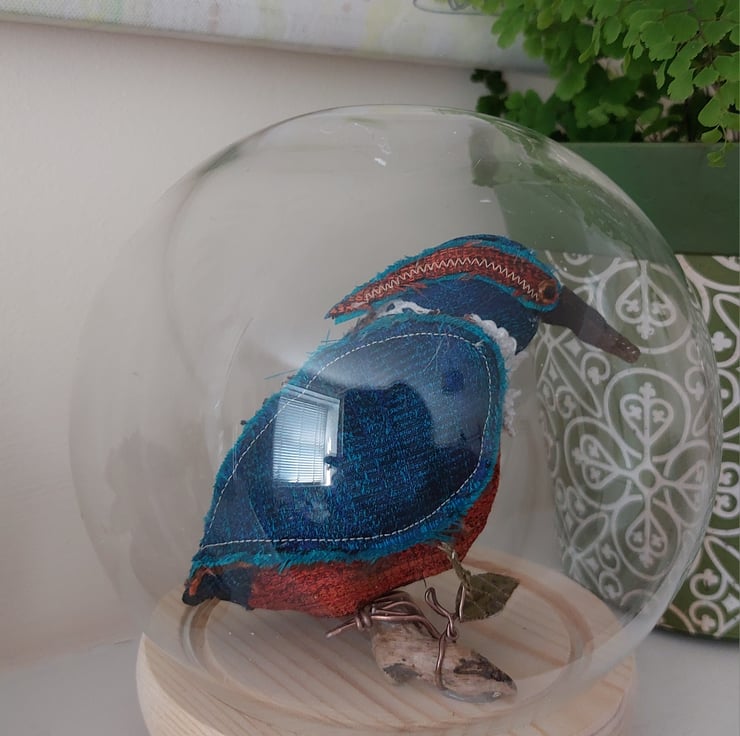 Quirky kingfisher soft sculpture mounted in a glass dome with wooden base. Whimsically handcrafted using fabric remnants and other recycled materials. Approx dimensions: 15 x 15 x 15cms.