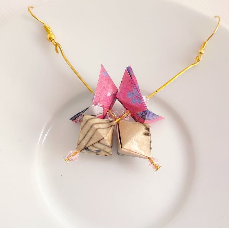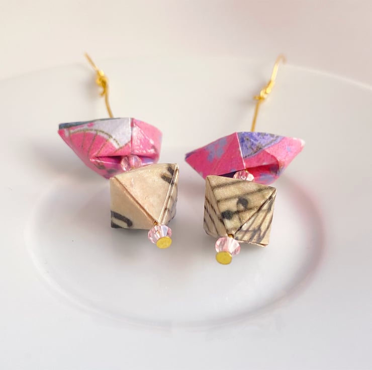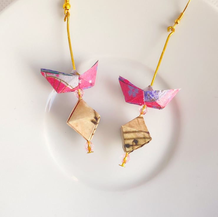 Handmade and carefully crafted origami boat with sphere earrings, each piece is unique.