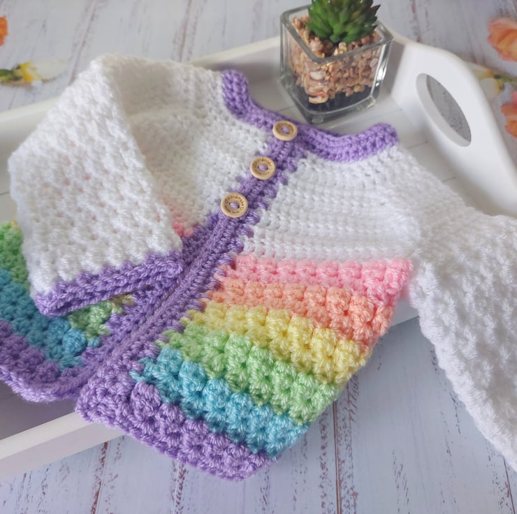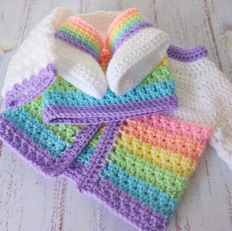 The cardigan, booties and hat are made in one piece, keeping them seam free for great comfort.
