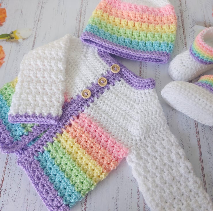 Rainbow Crochet Baby Set, Cardigan Bootie and Hat Unicorn Theme Set
