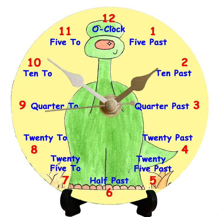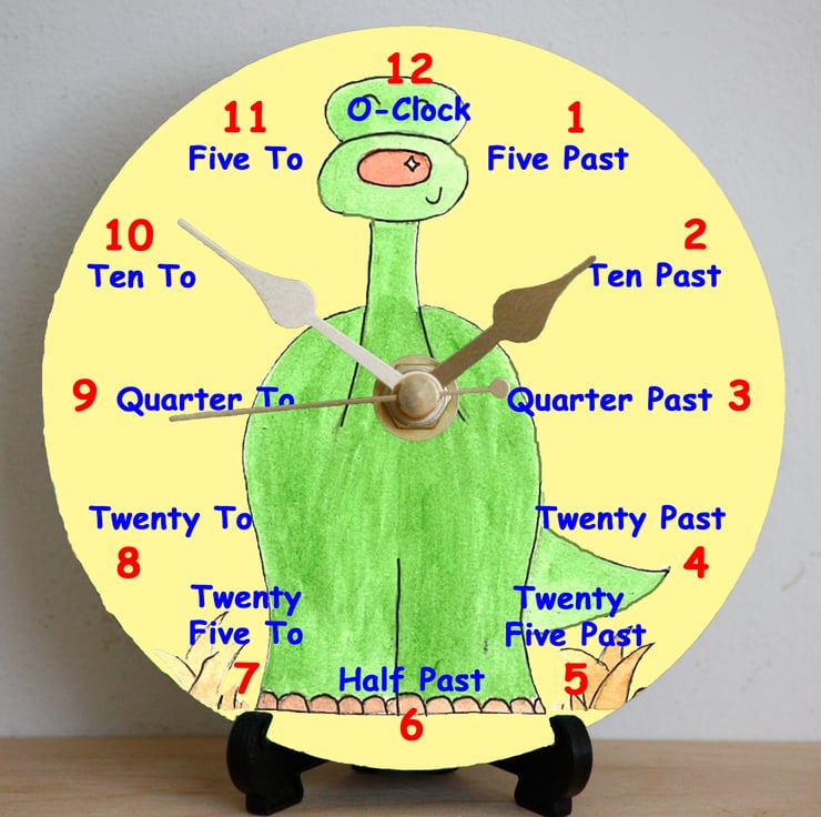 The clock face is made up of both letters and words to help when learning to tell the time.