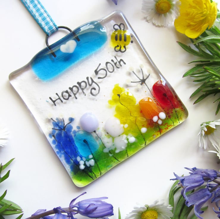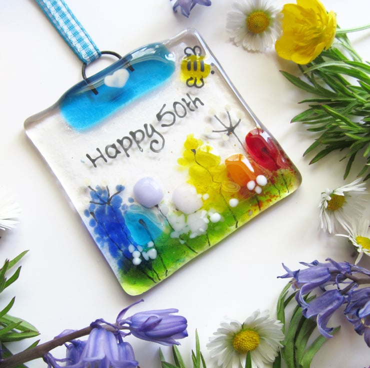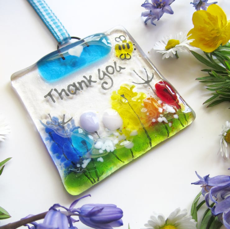 Ideal as special birthday gifts, thank you tokens or to convey another message, the suncatcher is hand made with fusing glass in our Rainbow Country Meadow design.