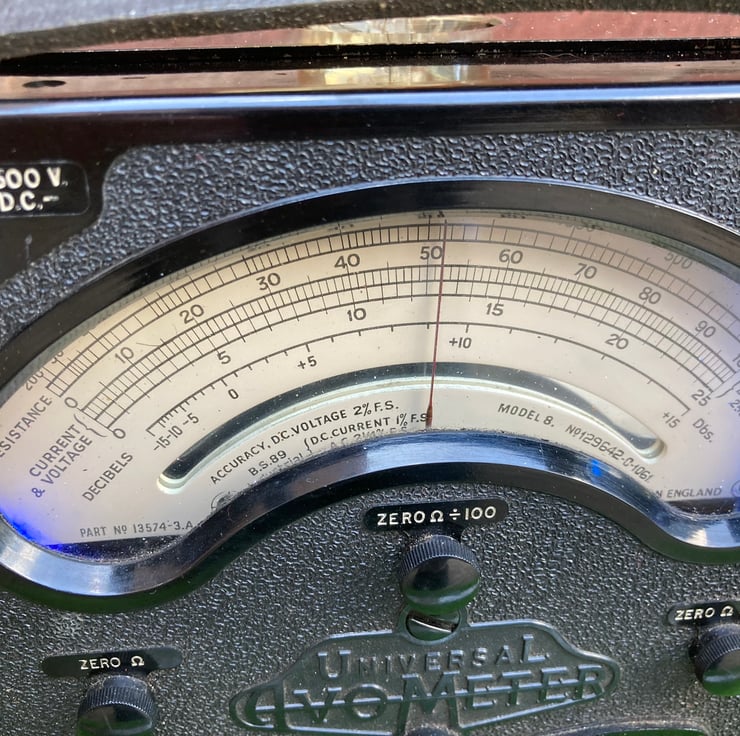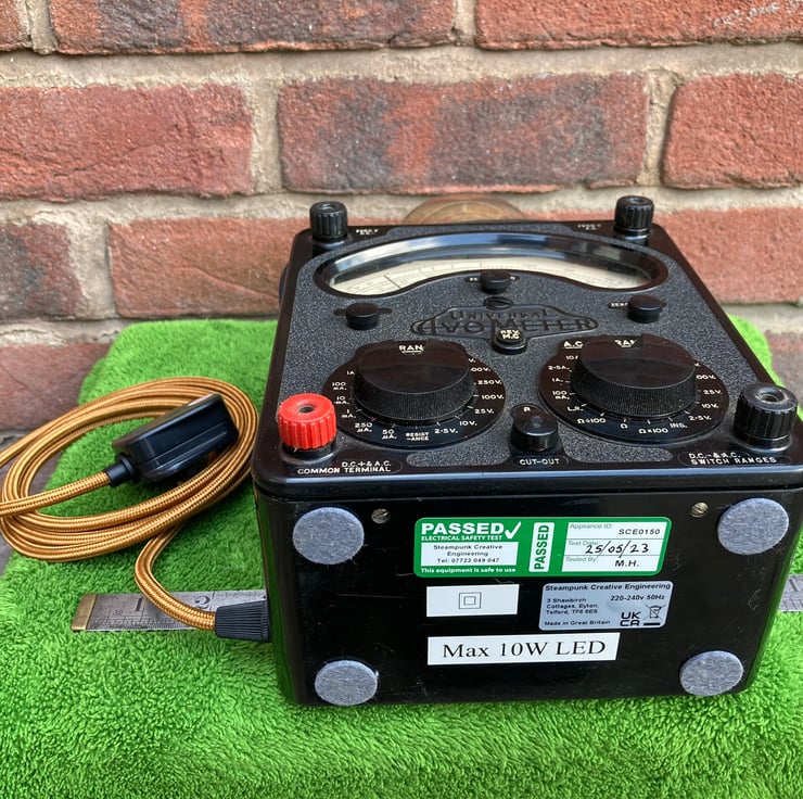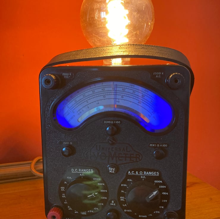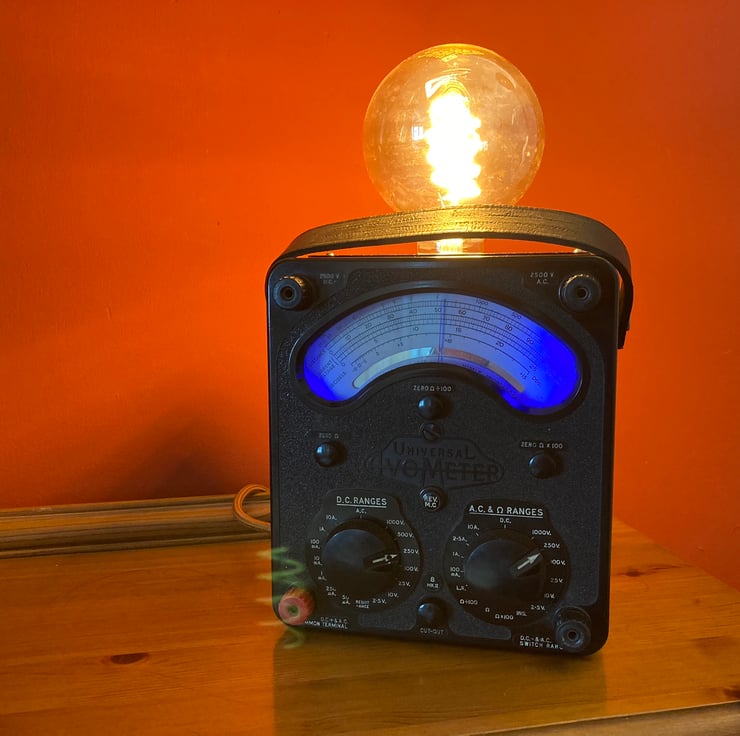 I have removed the windings, transformer and internal wiring and converted the meter into a safe and highly decorative table lamp. An ES (E27) lampholder is mounted through the base of the battery compartment so it is hidden inside the meter body with just the globe of the bulb showing. The original DC selector dial is used as a switch for the main lamp. A USB transformer, switched by the AC selector dial, powers the internal blue LED lighting (4 reclaimed fairy lights) and the meter needle which moves when on. Please note that this is not a readout of your mains voltage as it is powered by the transformer through a resistor.