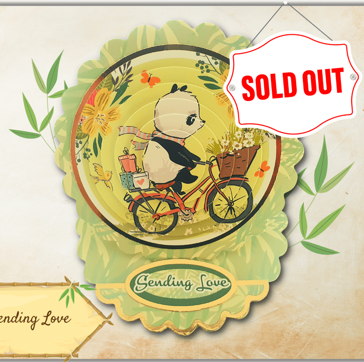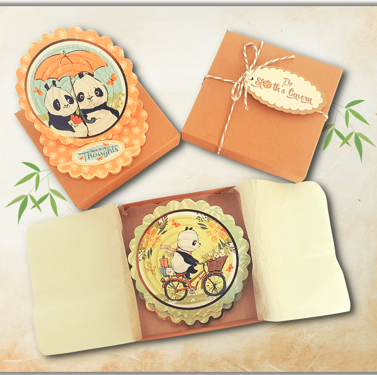 A set of two (2) 3D decoupage easel note-cards, handmade using the Hunkydory "Happy Panda" card collection. Different layers of the same image in different sizes have been put together, starting from the biggest and finishing with the smallest layer on the top, to give a three dimensional look on the finished image.