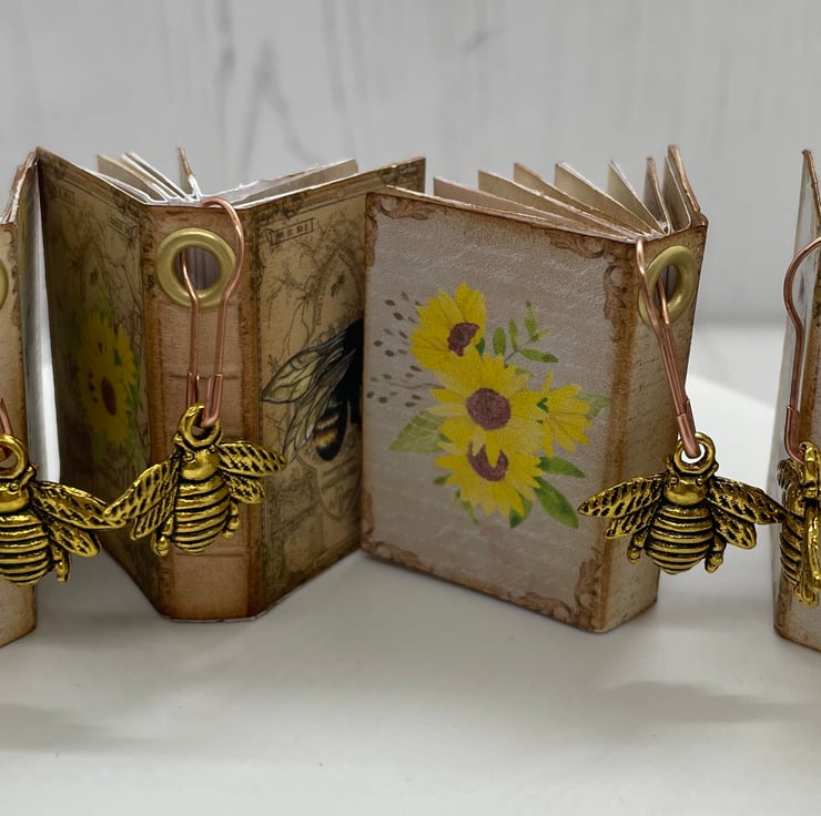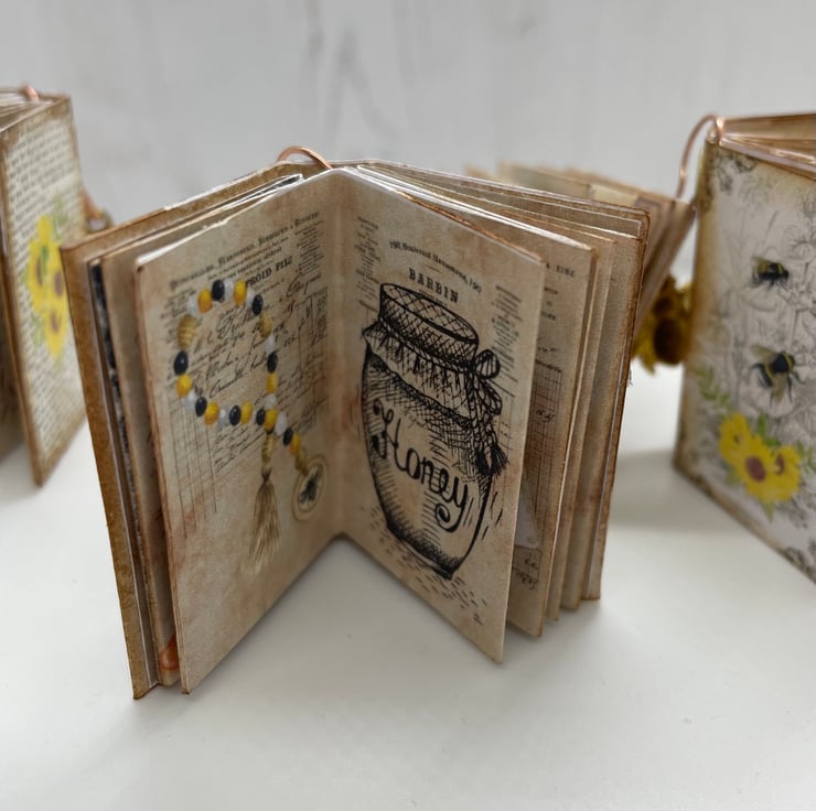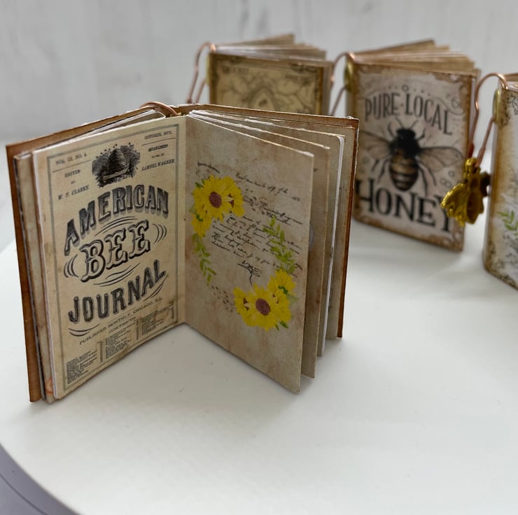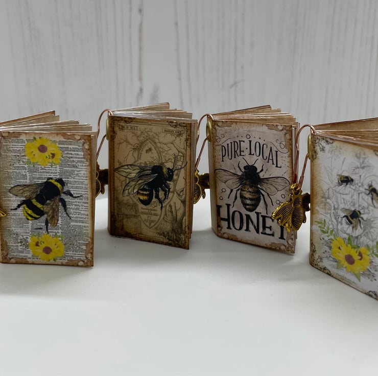 Tiny little books measuring 1.75” x 1”. All about hers and honey. 16 pages of vintage bee prints. Eyelet with a bulb pin holding a bee charm. Easily attaches to a journal for decoration.
