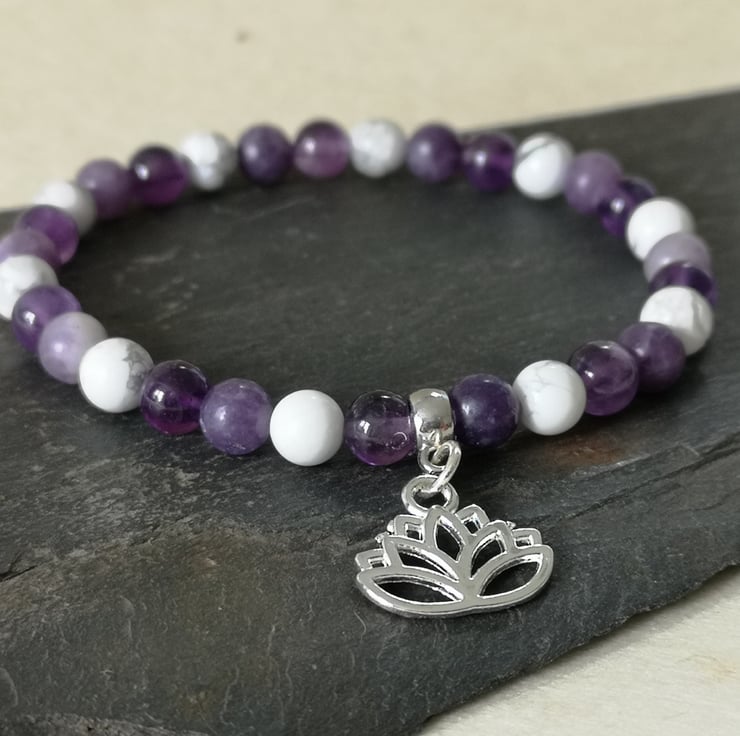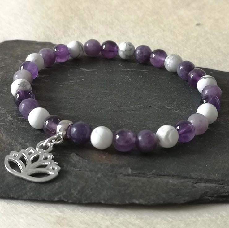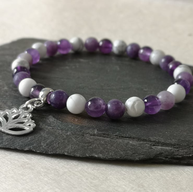 This bracelet features amethyst, lepidolite and howlite semi precious beads, all stones associated with the crown chakra. Amethyst promotes clarity of thought and inner piece, lepidolite is a calming stone and howlite is a stone of tranquility and stillness. A lotus flower charm is there to symbolise purity, spiritual growth and enlightenment.