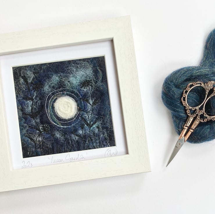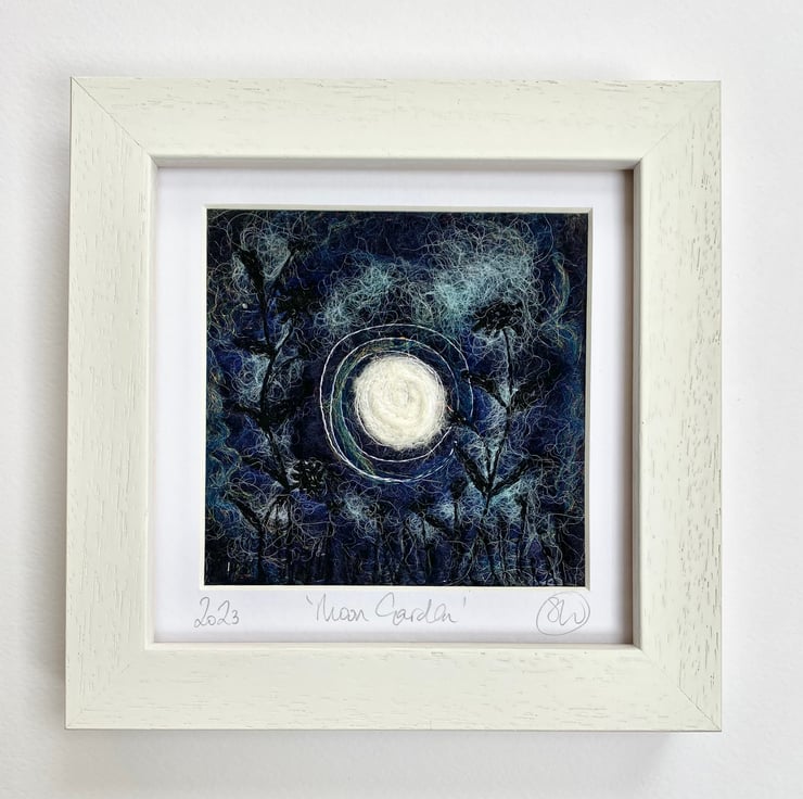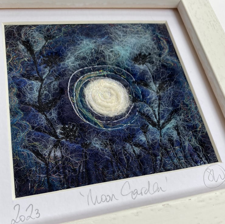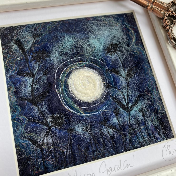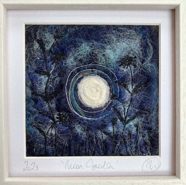 This atmospheric piece is part of my moon garden series. It shows a full moon with flowers, grasses and plants in silhouette in the foreground. It’s a wet felting and embellished with free motion embroidery.