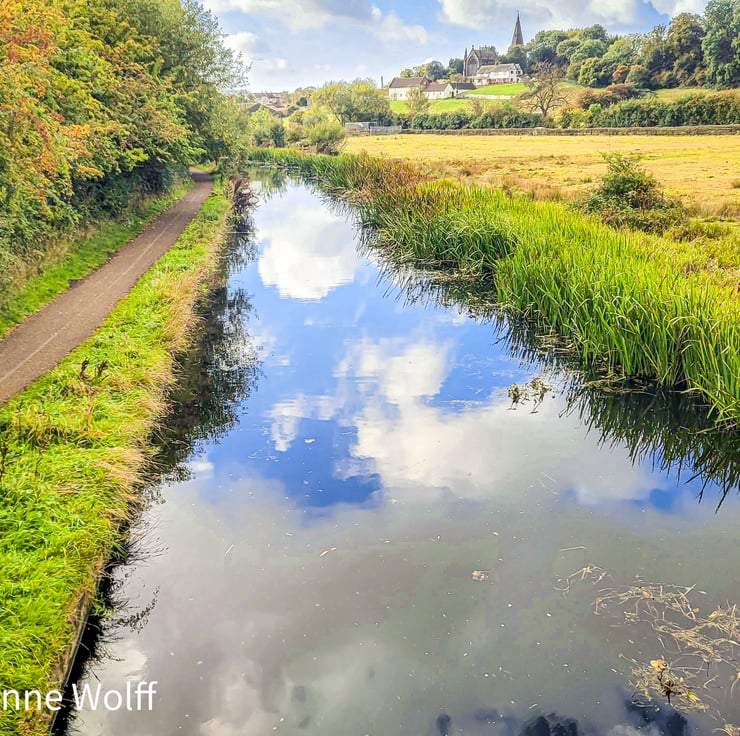 A view of Erewash Canal in Derbyshire on a bright spring day, the sky and clouds relected in the water.