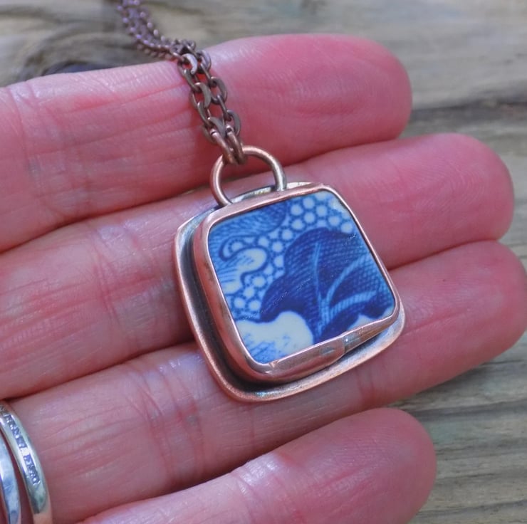 Made from copper, and old pottery shaped to soften the edges, and fit in a custom made copper bezel. Suspended form a sturdy bail and copper tone chain. Given an aged finish.