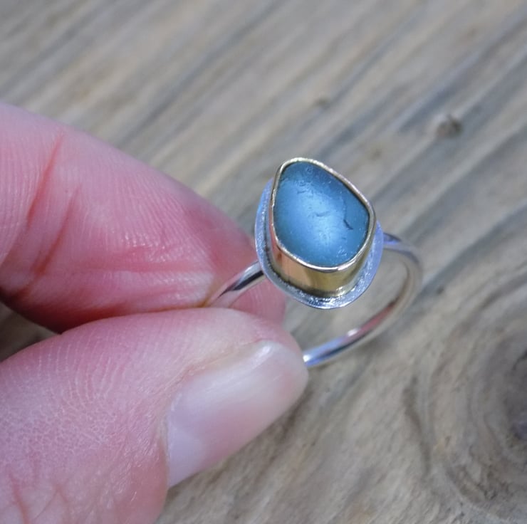 Made from a mix of brass and silver. A pretty piece of seafoam/pale aqua sea glass has been set in a brass bezel with a silver base, and soldered onto a1.8 mm sterling silver band. The brass reminds me of an old gold colour and really complements the sea glass. Size UK O.