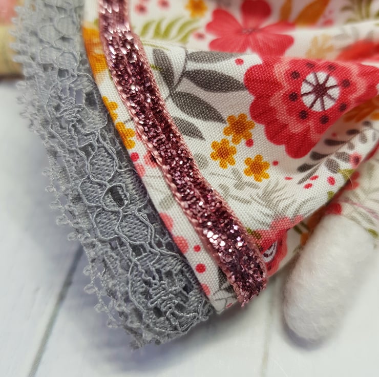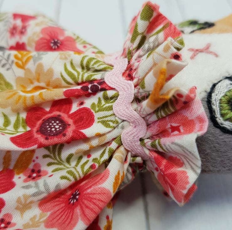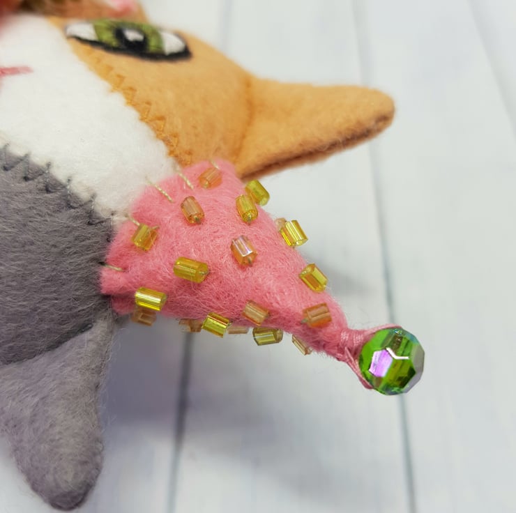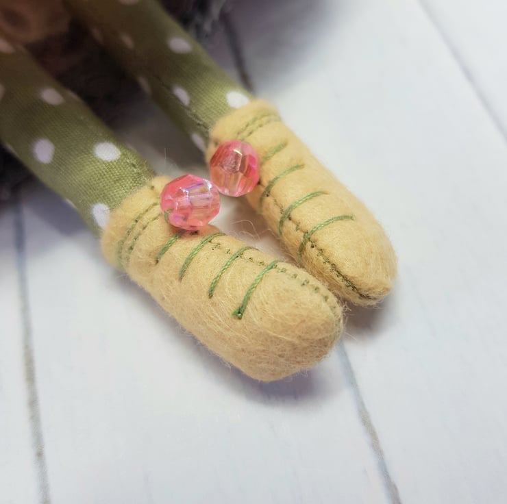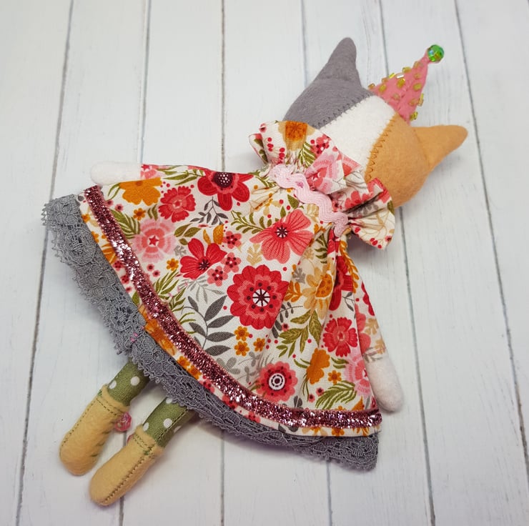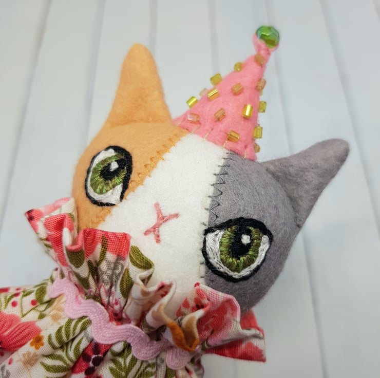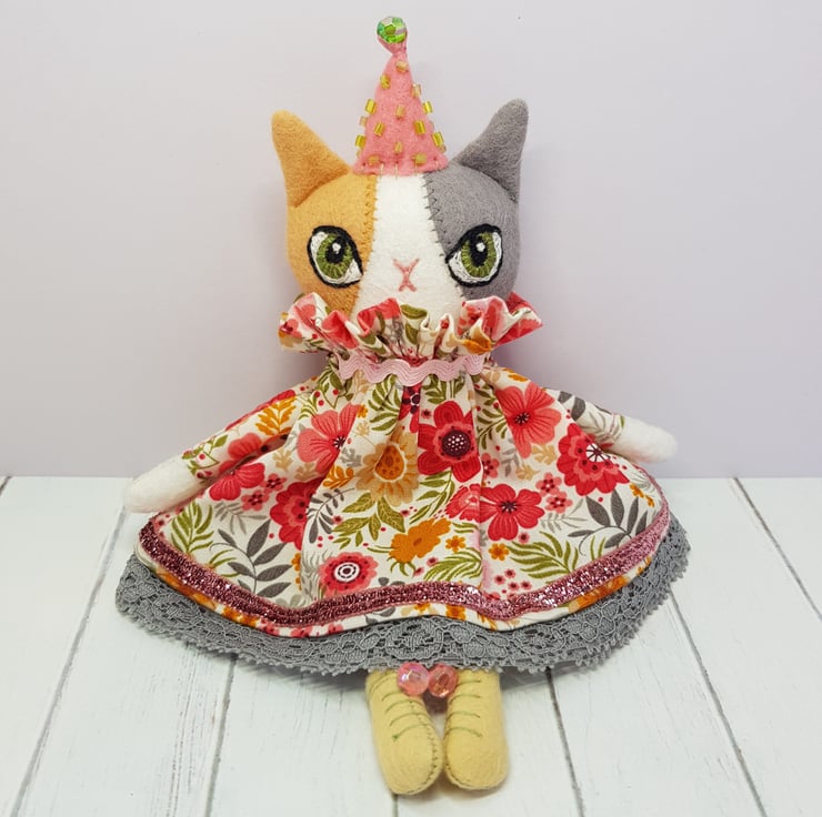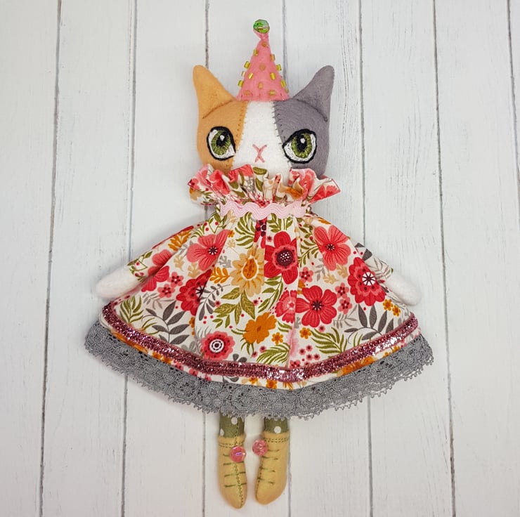 Art doll with felt body and hand embroidered face. Kitty wears a hand sewn floral dress with sparkly trim and a felt hat with beads sewn into place. Kitty has felt boots with thread laces and bead decoration. The clothes and hat are not removable and the doll measures roughly 19cm tall. This is for decorative purposes only and not a toy.