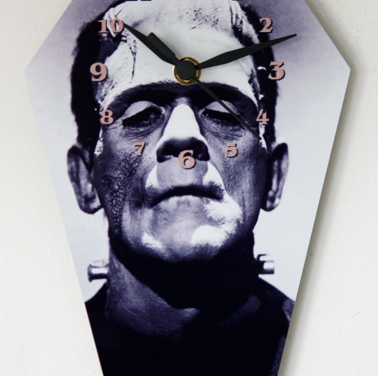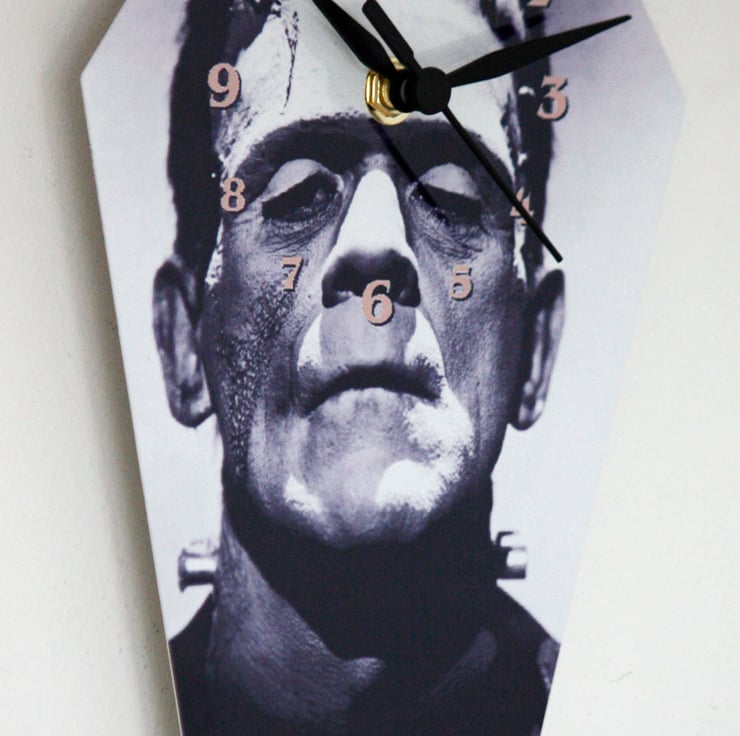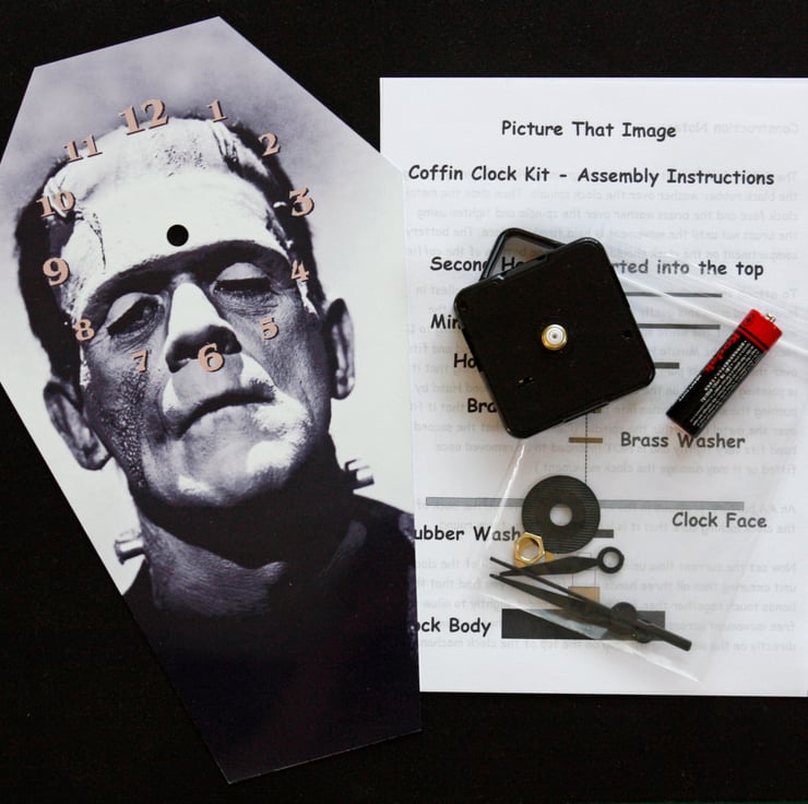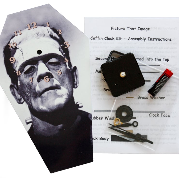 Everything that you need to build this unique coffin shaped wall clock is included in the pack. The clock is printed on a 25.5cm by 16cm aluminium coffin shape. The kit comes with a full set of instructions with an easy to follow diagram. (It does contain small parts so is not for very young children)