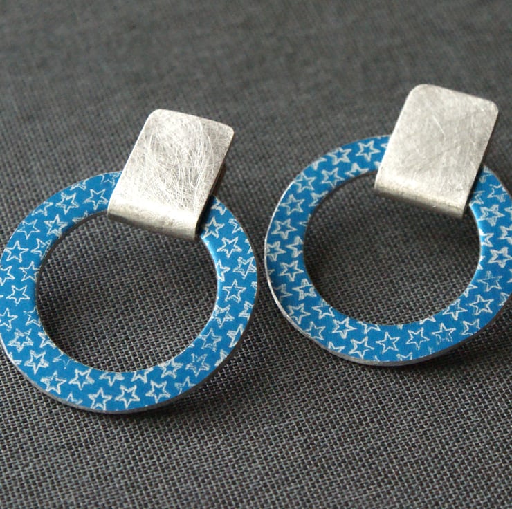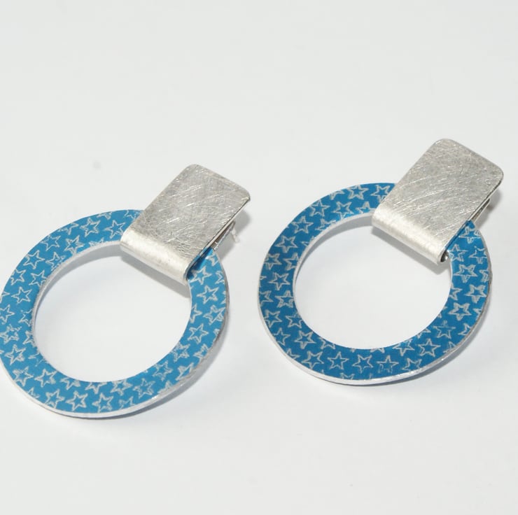A fab pair of earrings to brighten up your day. The coloured parts are hand cut from anodised aluminium which features my star pattern and has been hand dyed. They hang from a sterling silver part with a stud fixing with a satin finish.