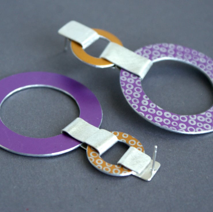 A stunning pair of earrings to brighten up your day. The coloured parts are hand cut from anodised aluminium which features my circle pattern and has been hand dyed. They hang from a sterling silver part with a stud fixing and the 2 circles are joined with a silver band - the silver has a satin finish. These earrings are super light despite their larger size - this is due to the aluminium used in the circle parts.