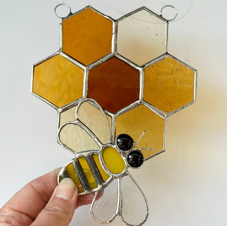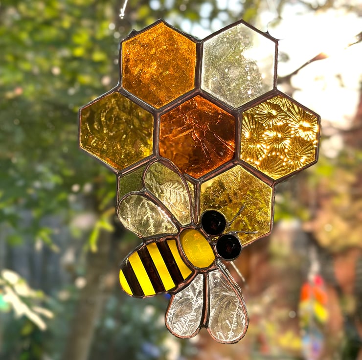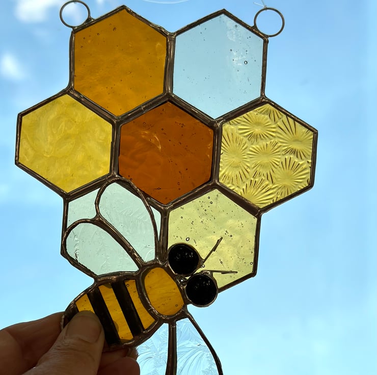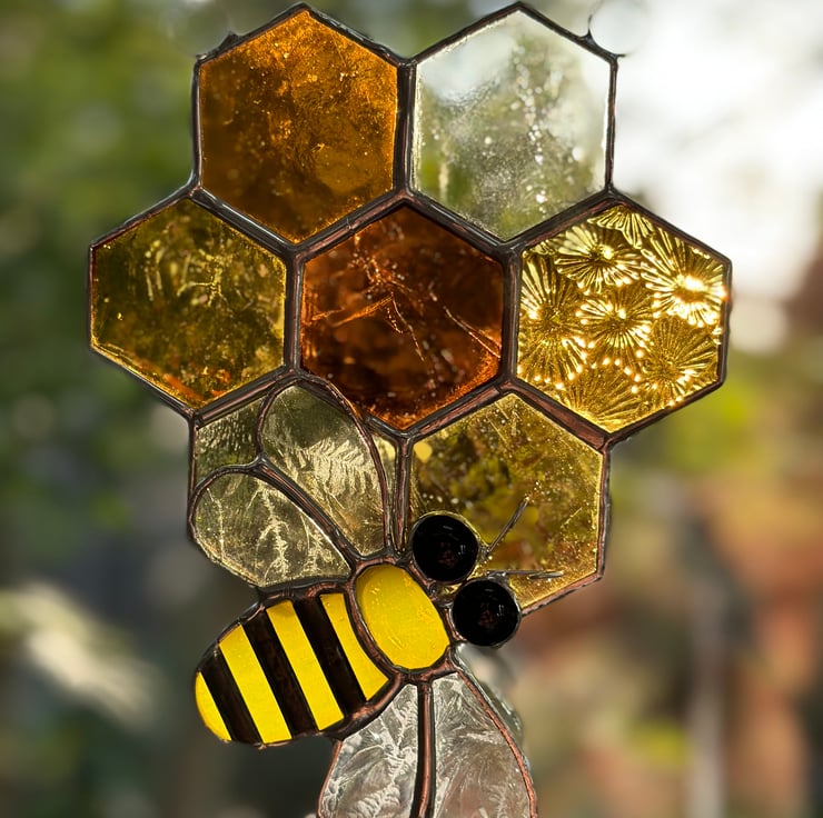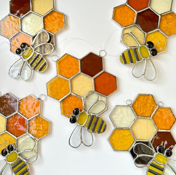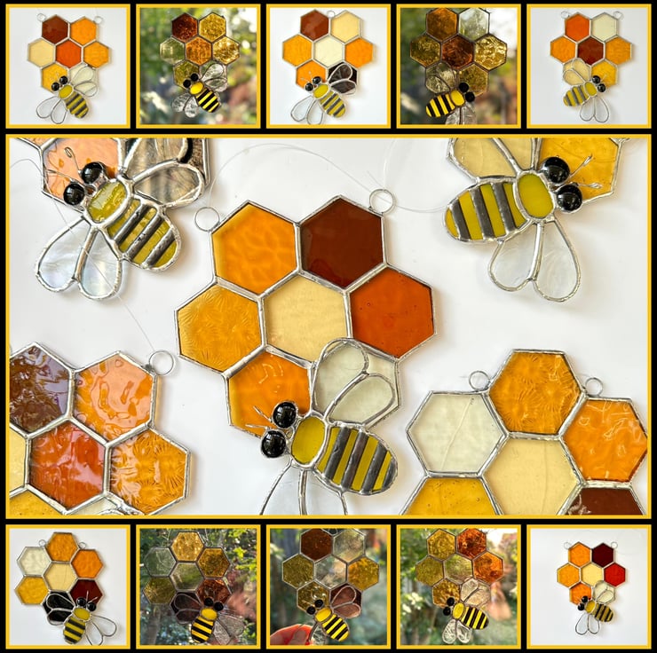 The honeycombs have been made using a selection of different shades of amber stained glass with some great textures. The bees has been made from yellow sea glass and clear double glue chop glass for the wings.
