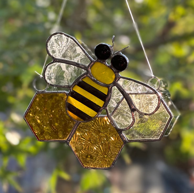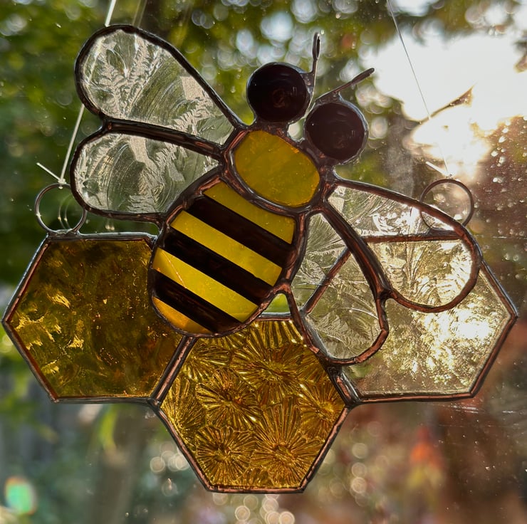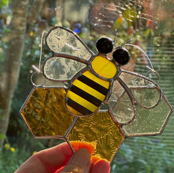 Each piece of glass has been hand cut, ground, washed, foiled and soldered together before being washed again. Patina has been applied to the stripes on the bee to blacken them.