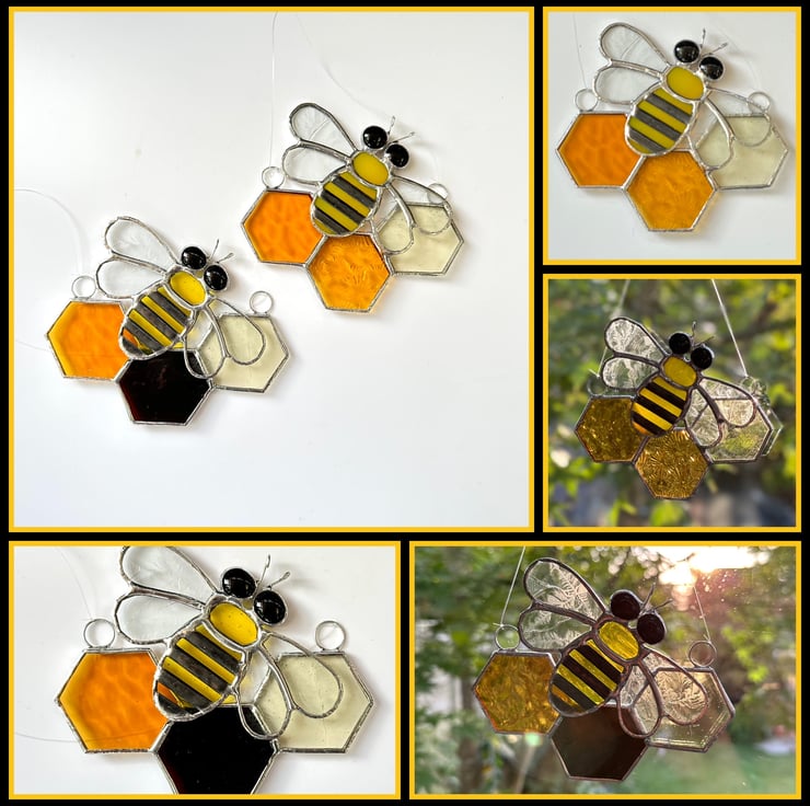 The honeycombs have been made using three different shades of amber stained glass which have some great textures. The bees has been made from yellow sea glass and clear double glue chop glass for the wings.