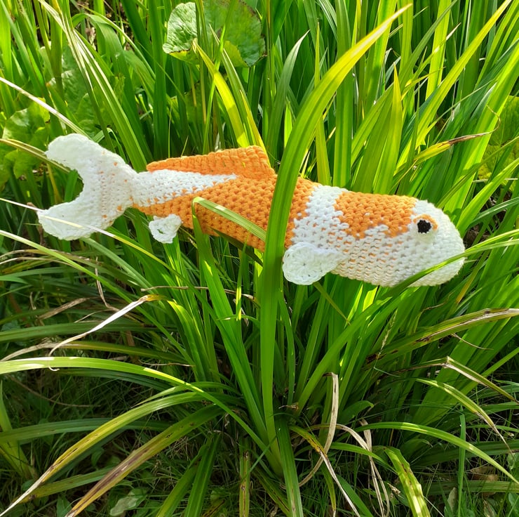 This large goldfish is crocheted in cotton and a cotton blend yarn and filled with polyester stuffing. It measures approximately 37 cm in length. A hanging loop can be added so that it can float freely in the air!