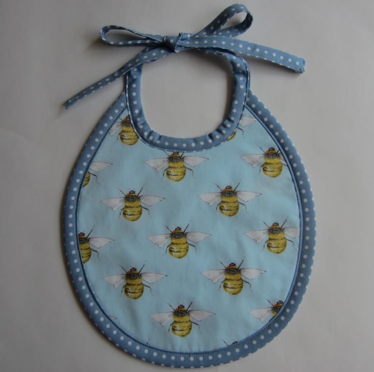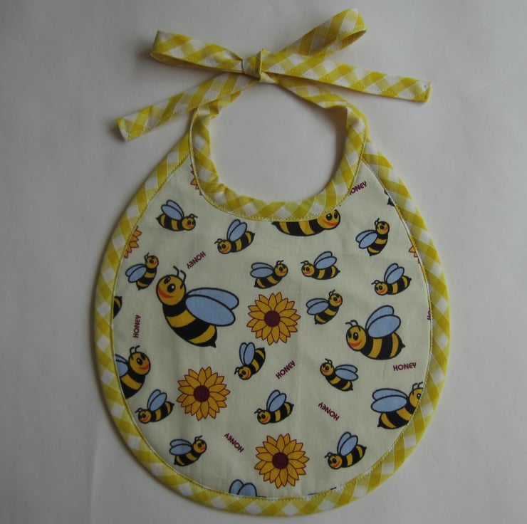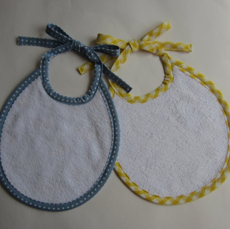 2 first size babies bibs featuring bees backed with white towelling for extra protection.