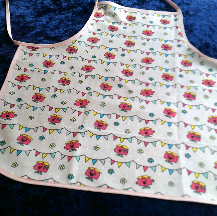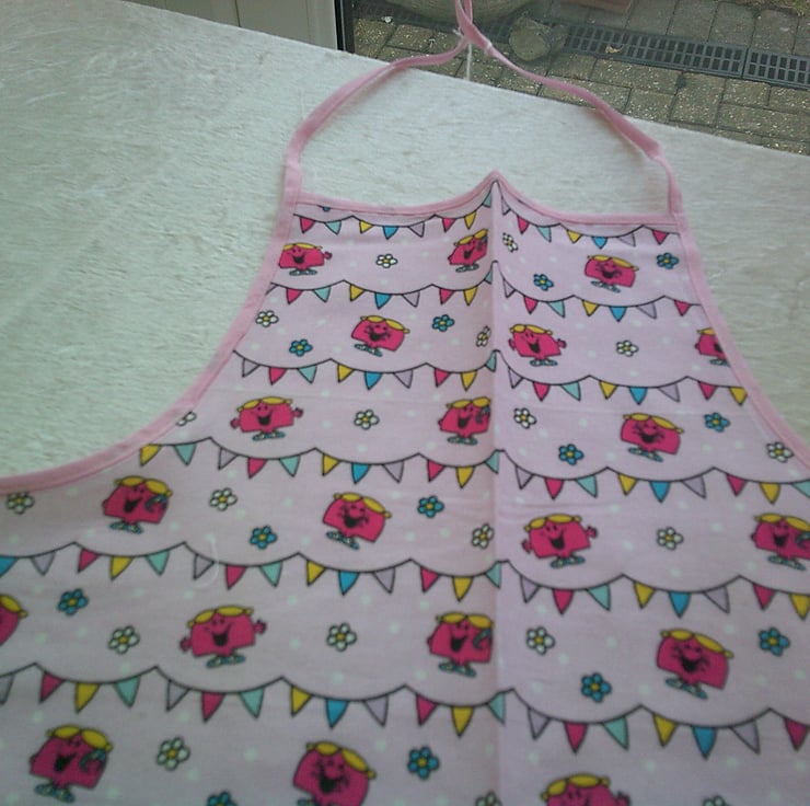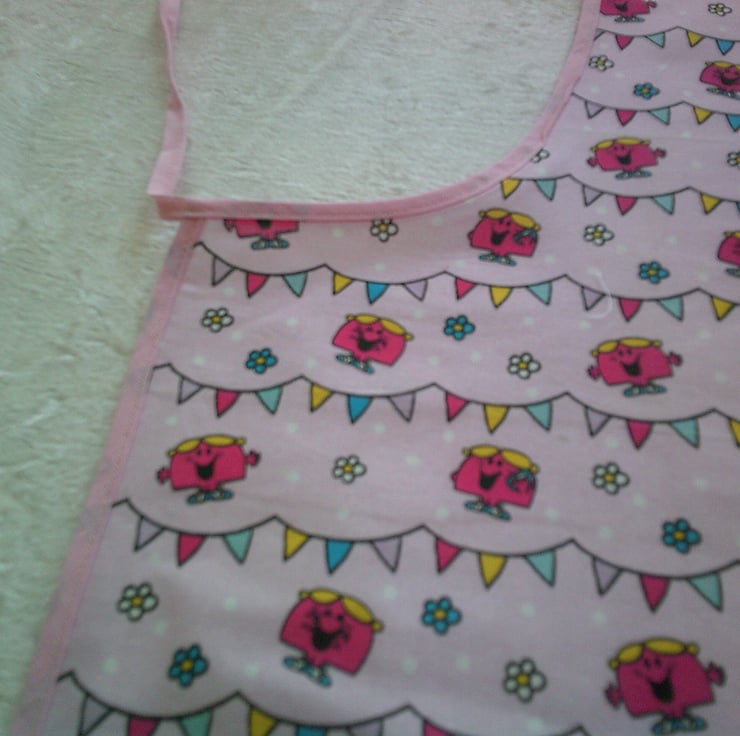 The on the fabric is of Little Miss Chatterbox with bunting and flowers on a pale pink background and is edged with pink bias binding.