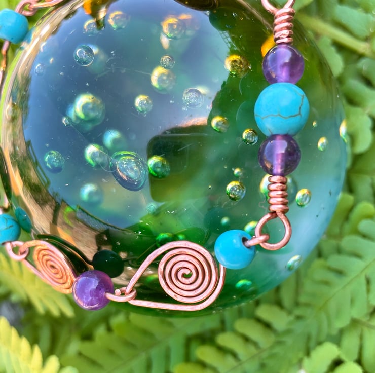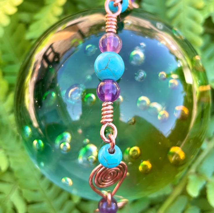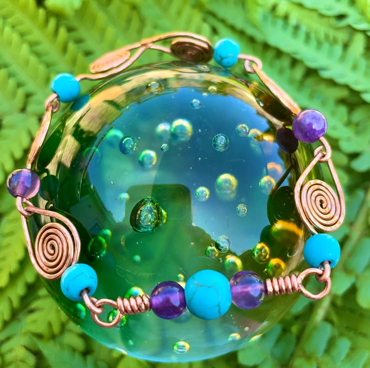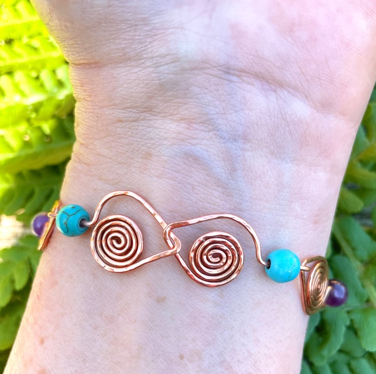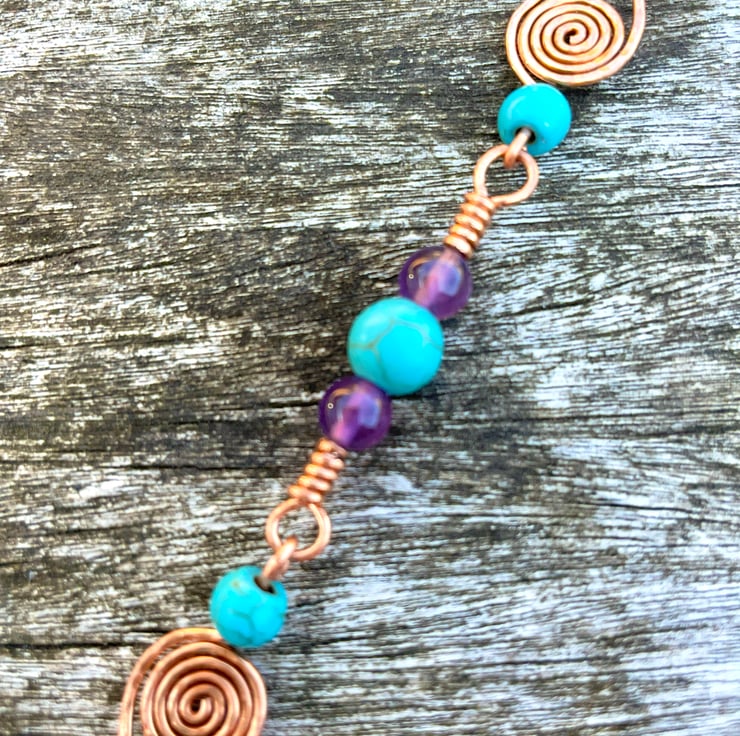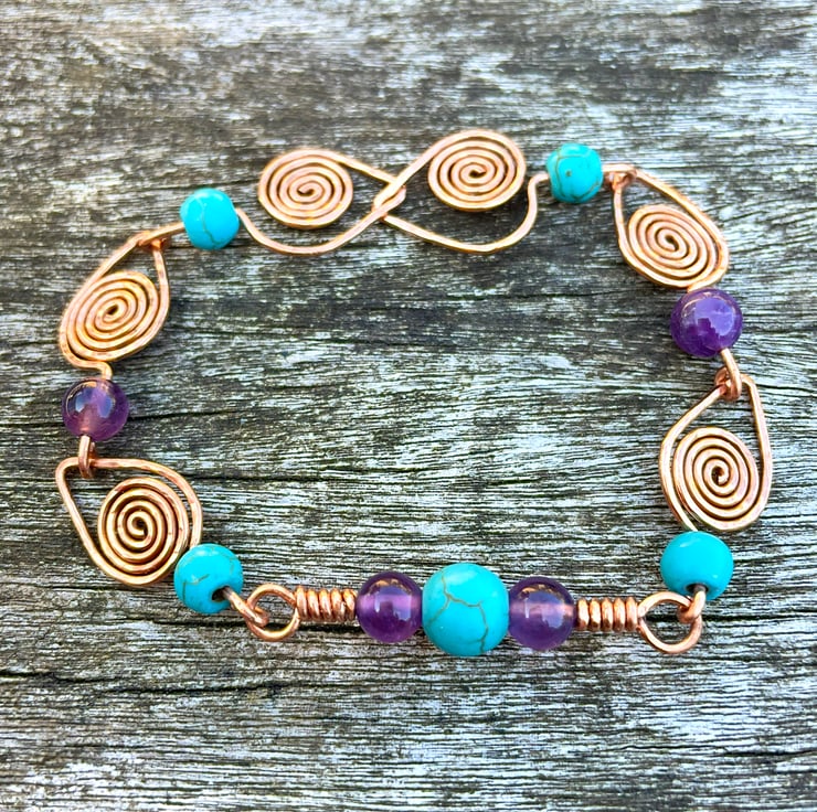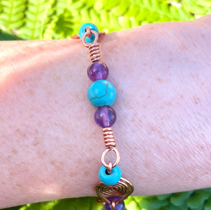Handmade Amethyst and Howlite copper spiral leaf bracelet.