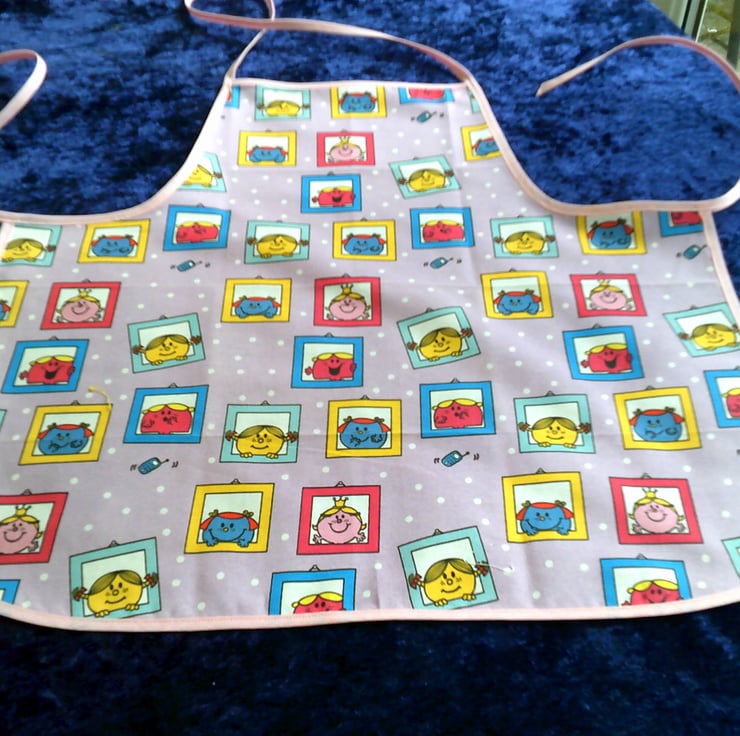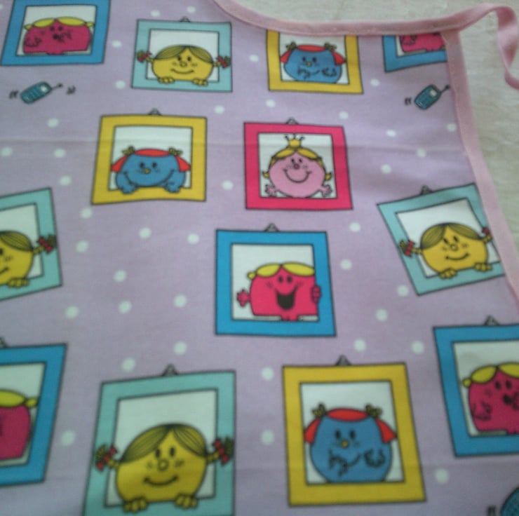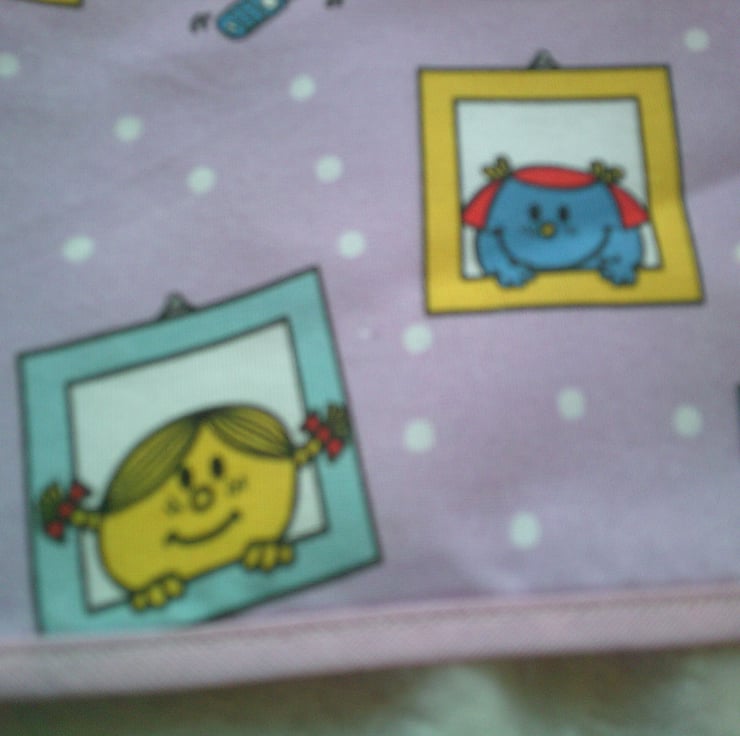 The fabric used is of Little Miss Sunshine, Little Miss Chatterbox, and Little Miss Princess on a pink background and is edged with pink bias binding.