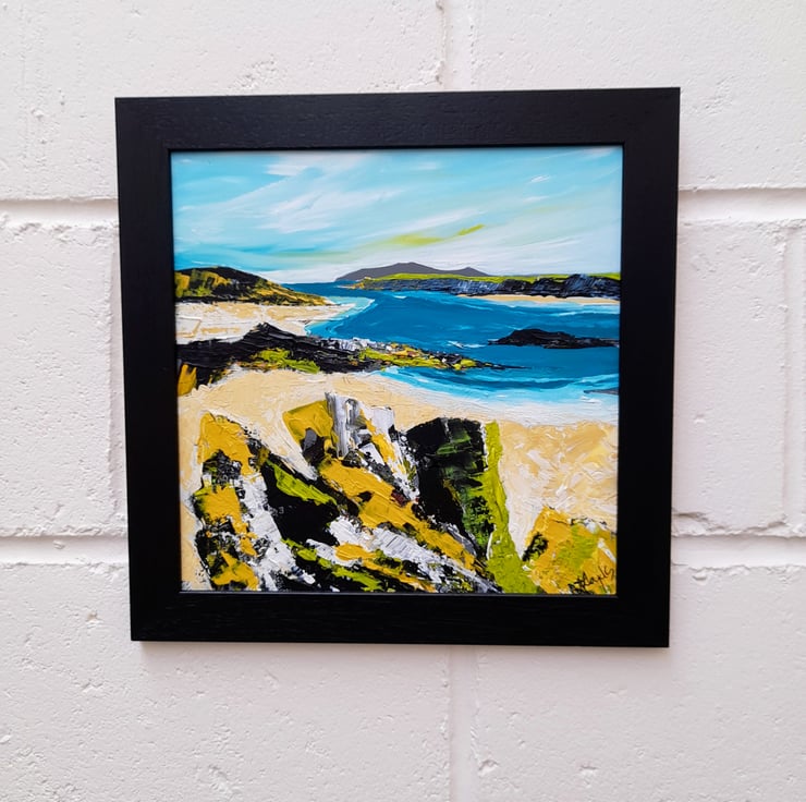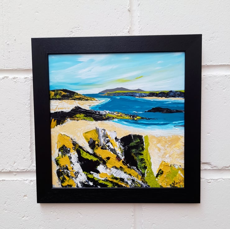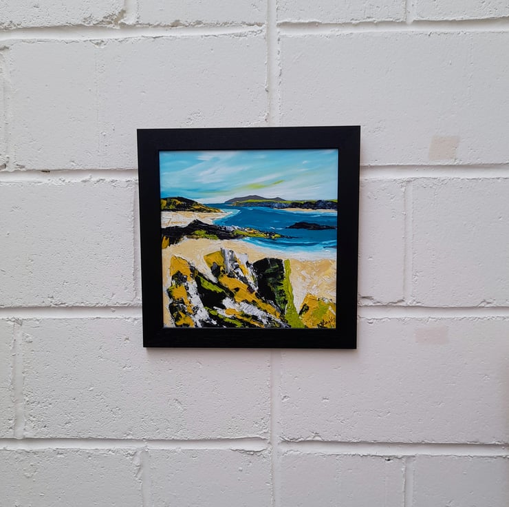 This 36 x 36 cm painting in a frame is inspired by memories around the western isles of Scotland.