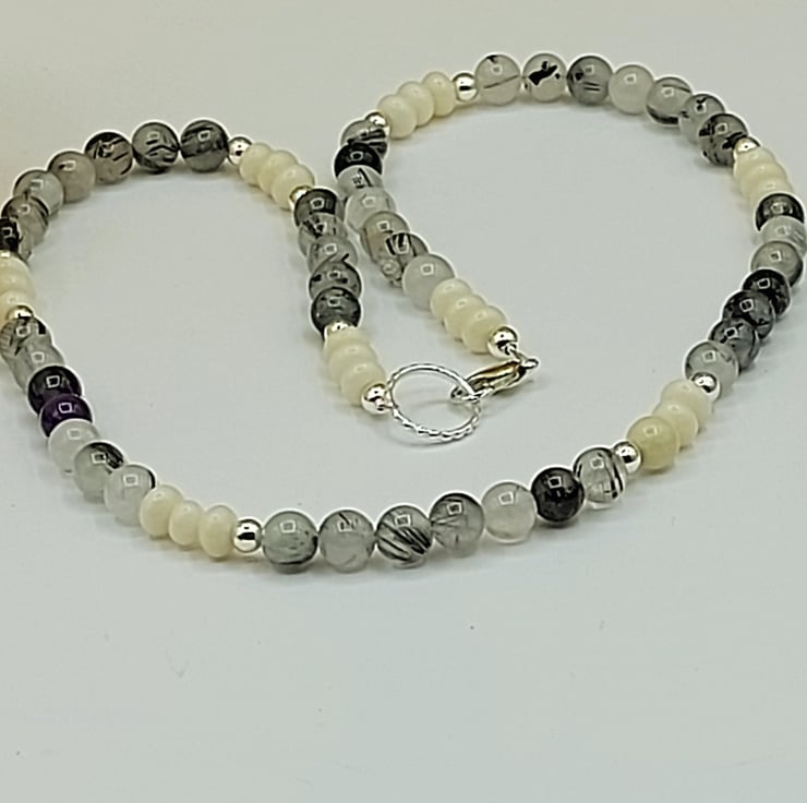Experience the allure of contrasting elegance with our mesmerizing Black Rutile and Ivory Gemstone Necklace.