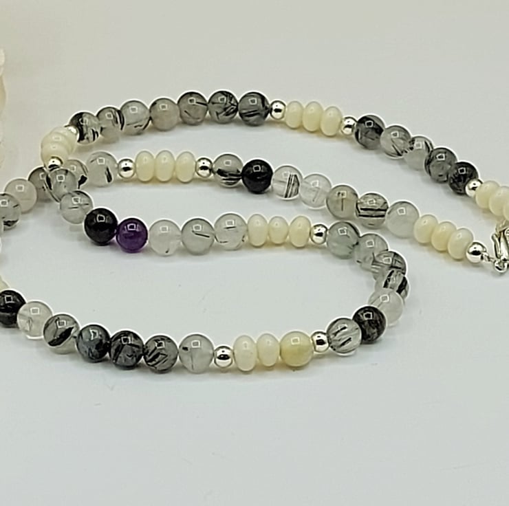 Experience the allure of contrasting elegance with our mesmerizing Black Rutile and Ivory Gemstone Necklace.