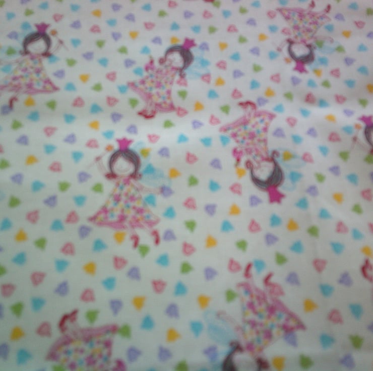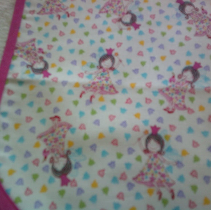 The design features Fairy Princess with tiny flowers on a white background and is edged with dark pink bias binding.