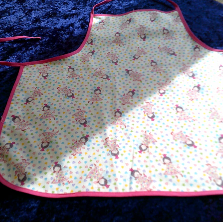 It is fully machine washable on a 40 degree wash and is made from 100% Cotton. It is perfect for use when eating or even doing craft or painting.