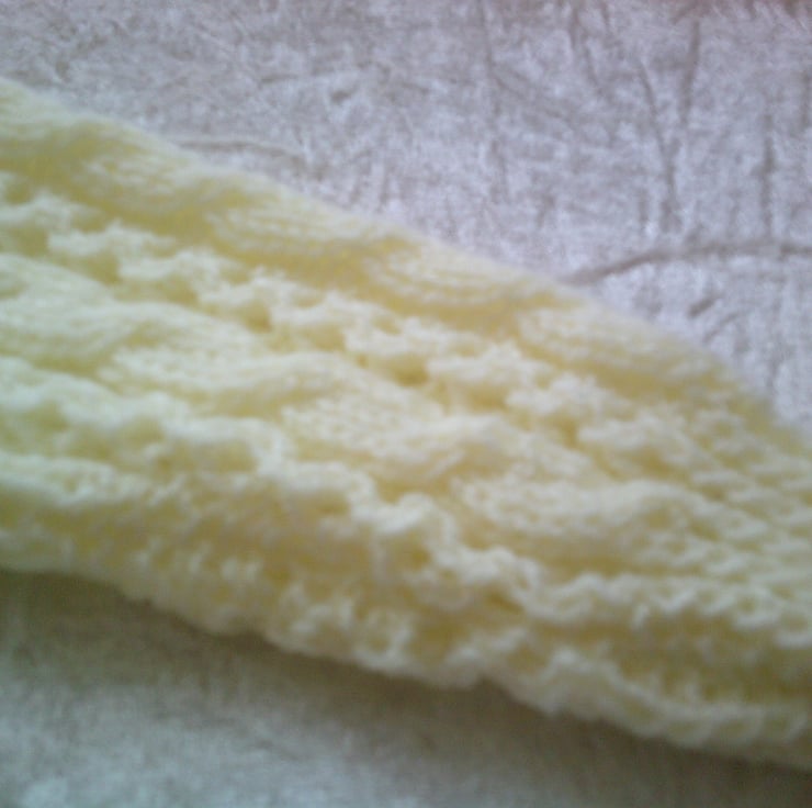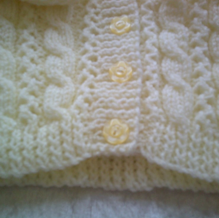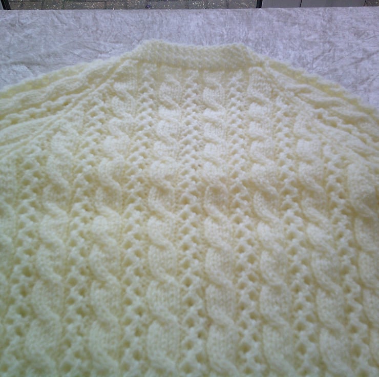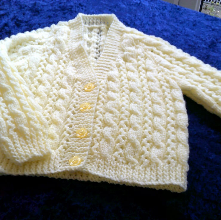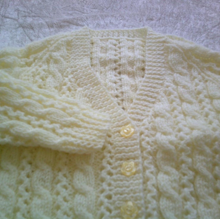 Hand knitted using acrylic yarn this V Neck Lemon Cardigan has an all over design of lace and cables and is ideal for using as an extra layer in the spring when the weather could be a little cool.