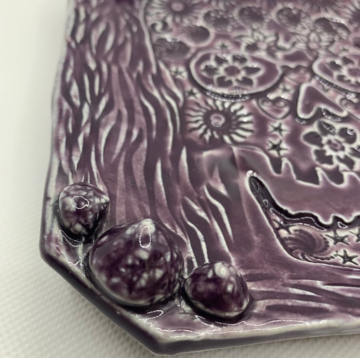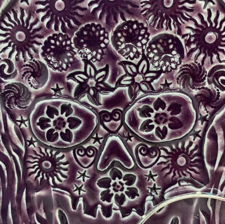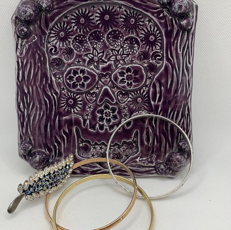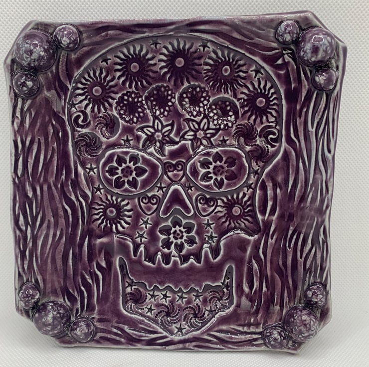 This square dish is made from stoneware clay. Its approximately 6ins square (15.5cms) and has an imprint of a skull decorated with all sorts of textures. Finished with a mulberry food safe glaze. The dish can be used for food if desired or be a great trinket dish for your bits and bobs! The colour is beautiful.