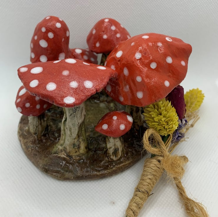Seven pretty toadstools all in a ring! Handbuilt from stoneware clay and hand painted. Its approx 3ins high. In the centre there is space for a tea light which is included. If this is to adorn a childrens room then a tea light isn't appropriate but maybe a little fairy could sit in the centre - fairy not included.