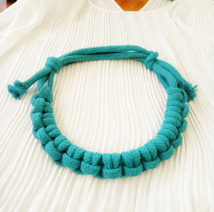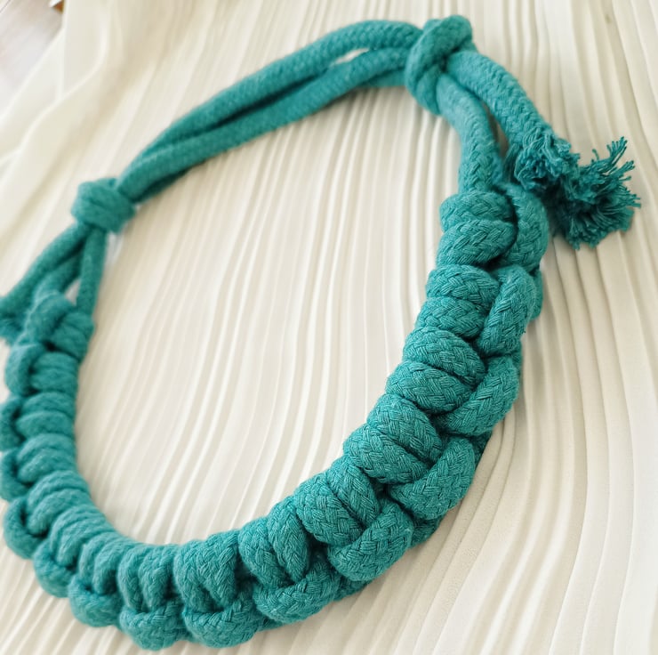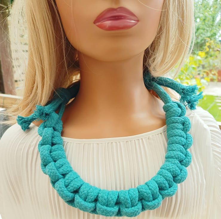 The Lycinda necklace is made from hollow braid, soft cotton rope using the lark's head knot. It has an inner circumference of approximately 60cm but can be made shorter or longer due to it's adjustable knot. It's a beautiful, trendy piece of modern jewellery very popular in today's fashion world. It's chunky and really bold. It will certainly get you noticed.