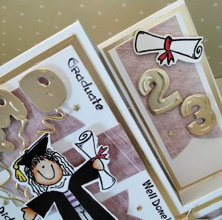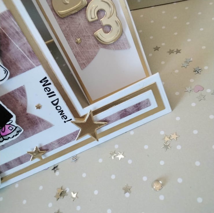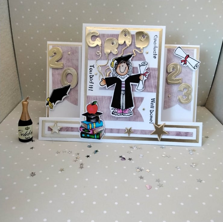 Hand-made, unique, luxury, personalized Graduation/exam stepper card, 8" x 5.5" rectangle card, 300gsm card base, with presentation box. Features of this card are; hand stamped/coloured character images of a person in graduation robes and cap, holding a scroll in one hand. colour scheme is white and gild with either a blue/dusky pink (or the colours of their establishment they attended) banners. Th central panel is embellished with 3 horizontal banners (in chosen colours) , alternating horizontally from side to side, across the top in gold foiled card is the word GRAD, balloon style, in the center is the character person of choice, then stamped top, middle and bottom are the words, graduate, You did it!, Well done! There is also a hand stamped/coloured, stack of bools with a graduation cap and Apple in top of them. On the two side panes there is a vertical banner with the year date, a cap and scroll ( split between the 2 panels), along the bottom panel of the card are a trio of gold foiled card stars.