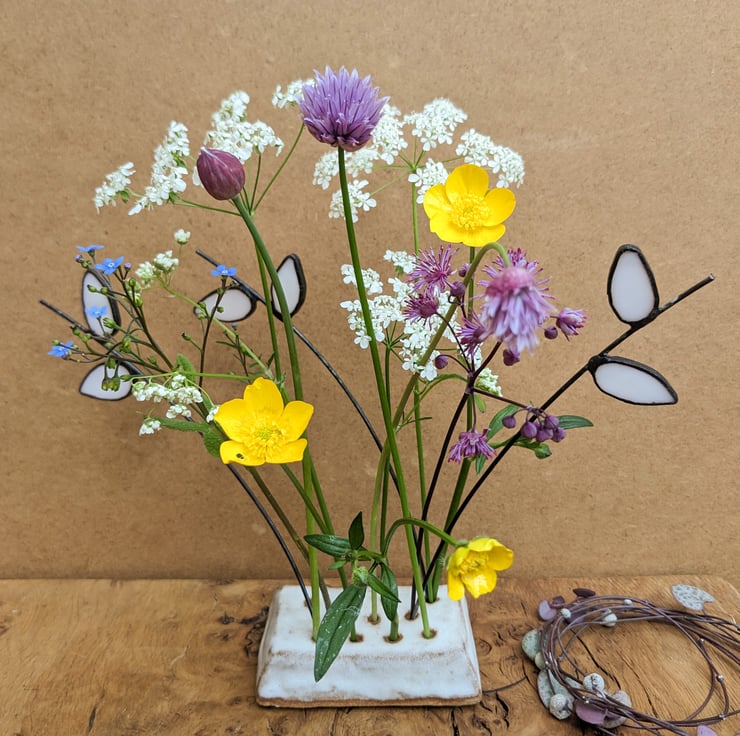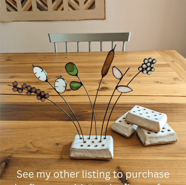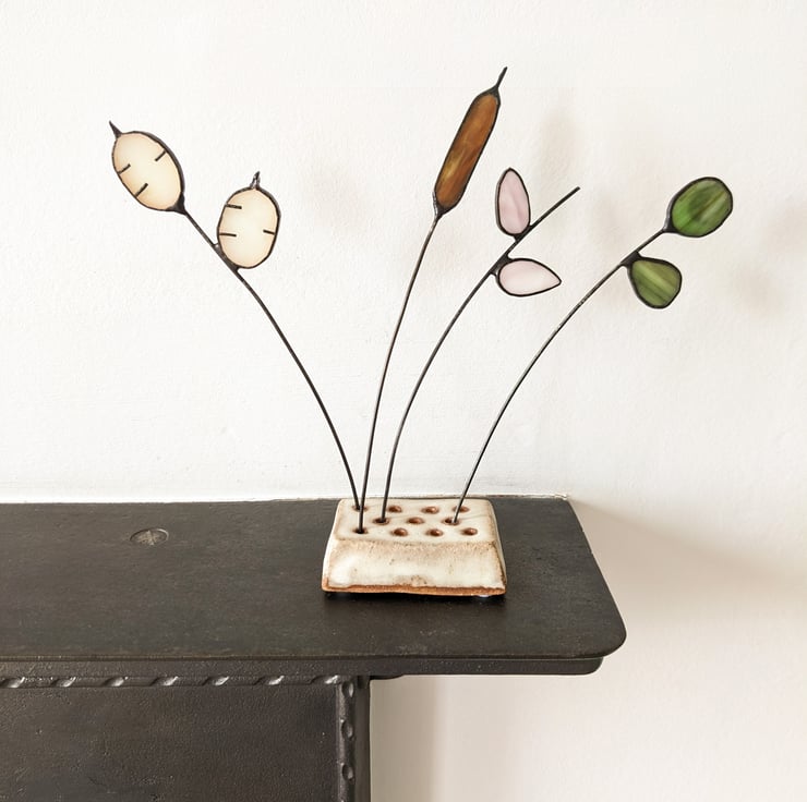 Handbuilt flower frog with your choice of 1-6 mini stained lass flowers: Eucalyptus (green), Honesty (cream); Pussy Willow (pink), Bulrush (brown), Lavender (pinky-purple) and Allium (white). Please let me know your choice of stems where prompted at checkout. (Prefer White Lavender, or Purple Allium? Just specify!)