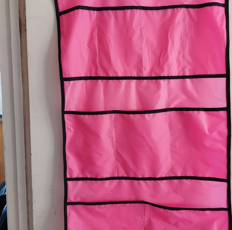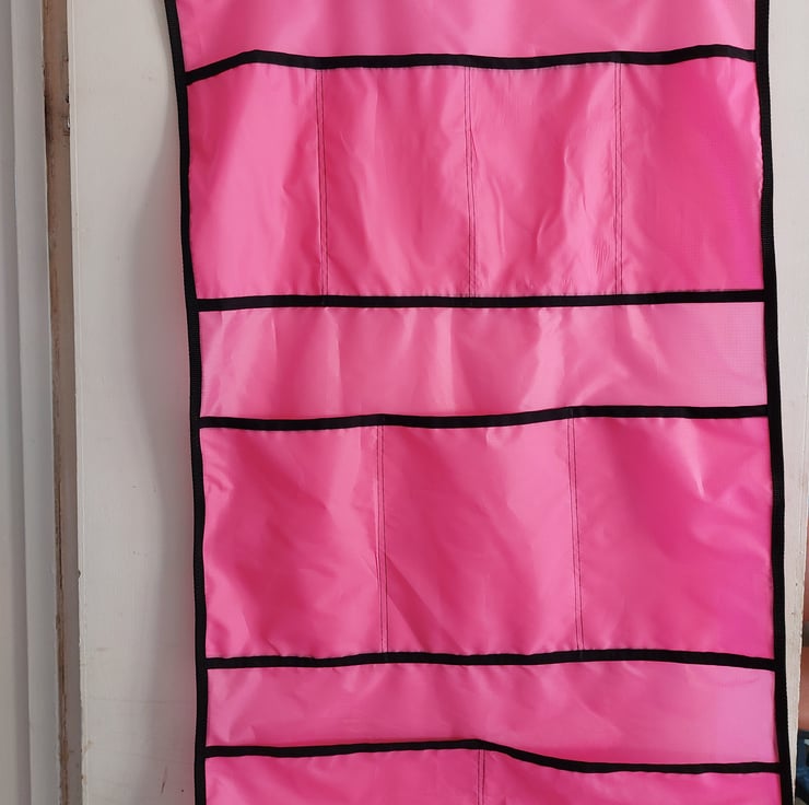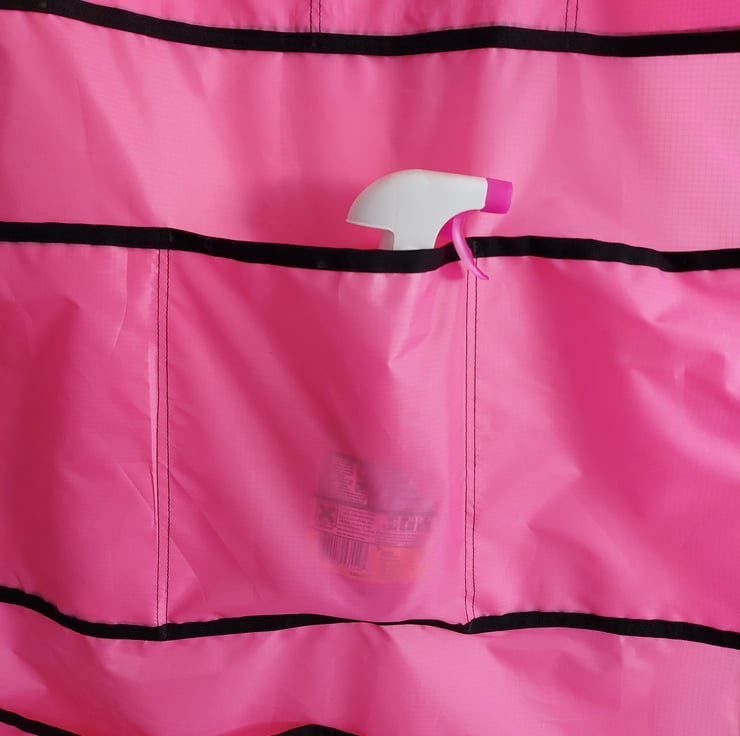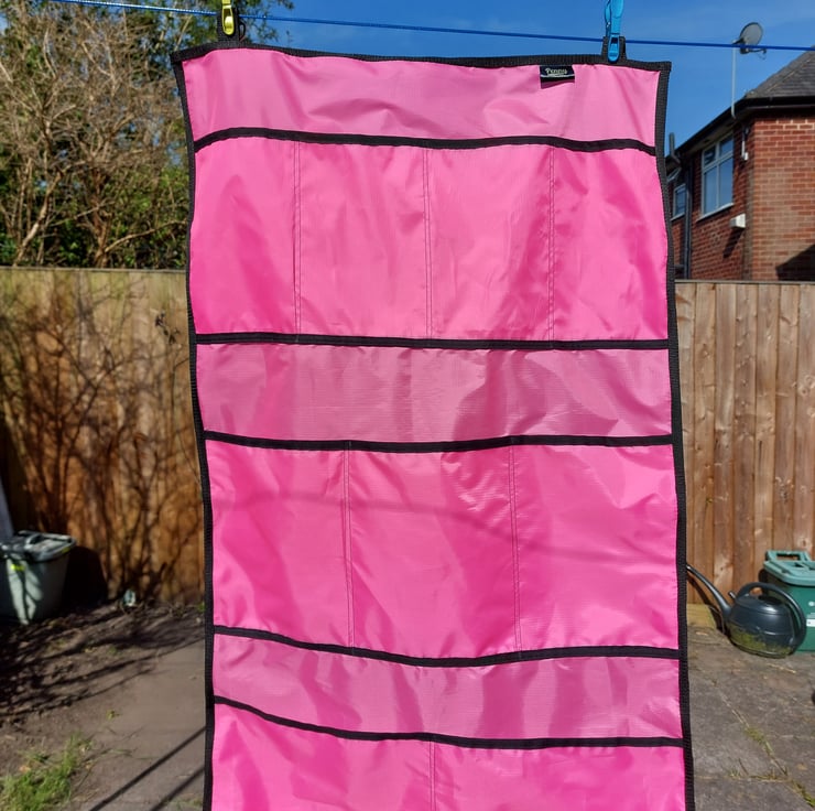 Organise all your grooming supplies and keep everything together using this newly designed stable organiser. Measuring 60cms wide x 100cms in length, pocket depths vary from 20 - 26cms. Made using a waterproof and lightweight ripstop fabric, with polypropylene webbing and chrome hangers.