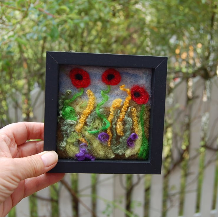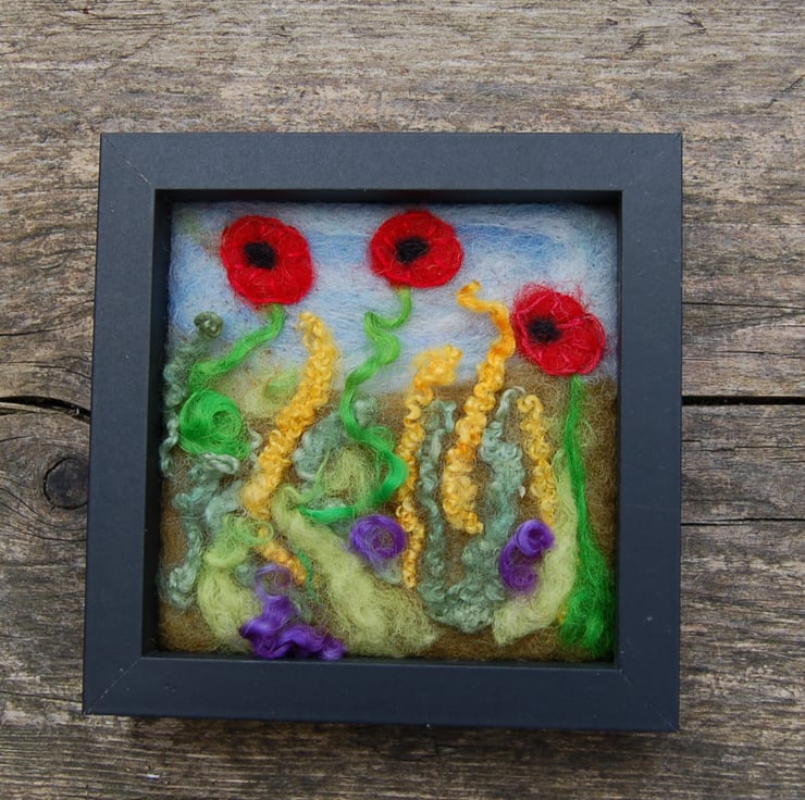 A pretty framed picture of Poppies, Needle felted onto vintage wool blanket and embellished with hand embroidered petals . Wool curls represent all the different grasses. Available with the new black wood frame or without the frame if you would like to display in your own choice of frame.