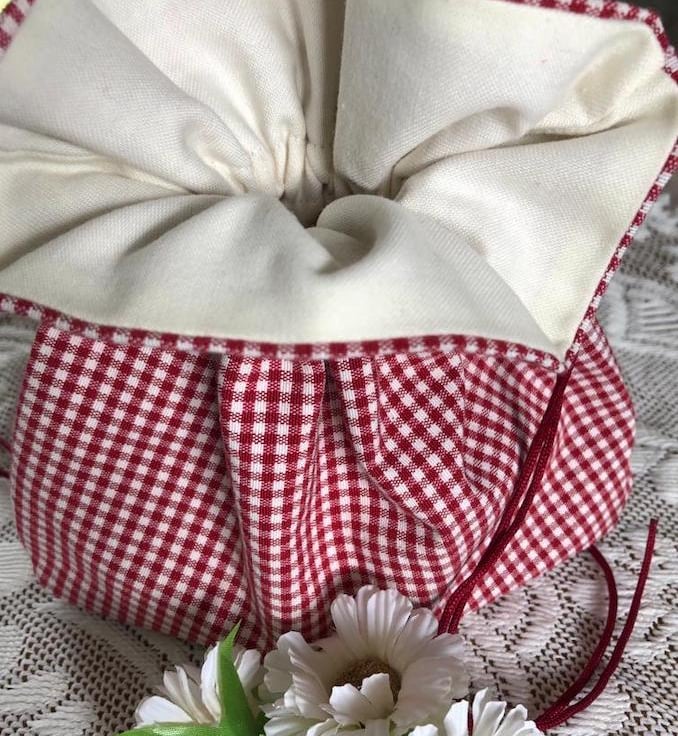 This gorgeous drawstring bag is made from 100% homespun cotton fabric and is lined with a rich ivory cotton lining.