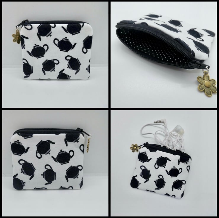 Black and white Teapots. Black and white spotty lining. Black zip finished with flower charm. 10cm x 8cm