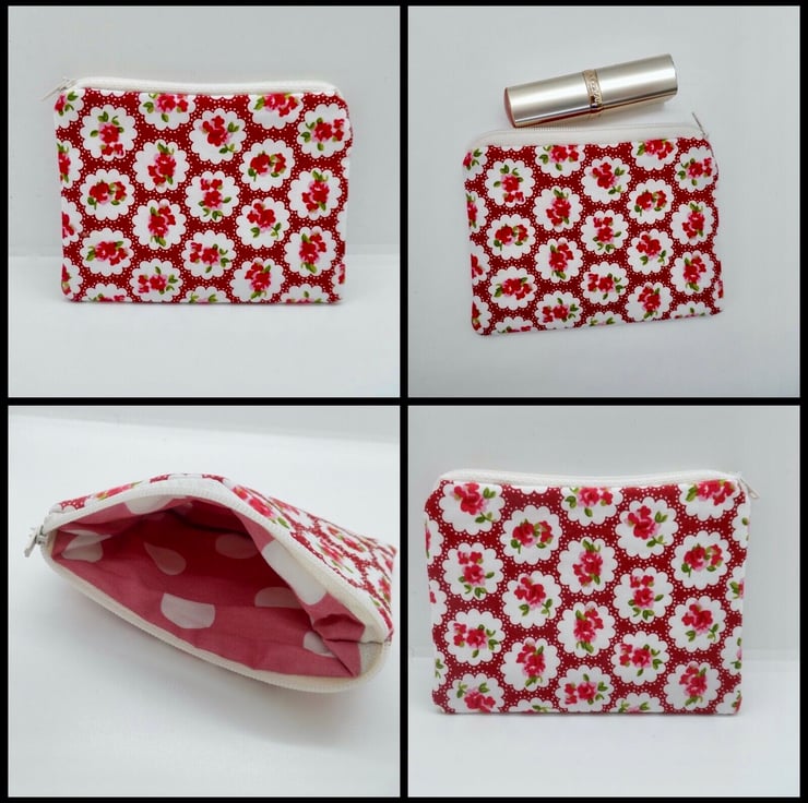 Red and pink roses. Pink and white big spot lining. Ivory zip. 12cm x 9cm