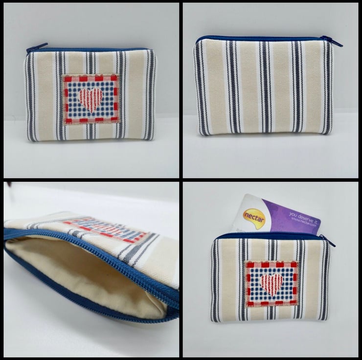 Cream and navy stripe with rustic heart appliqué red white and blue on the front. Cream cotton lining. Blue zip. 12cm x 8cm.