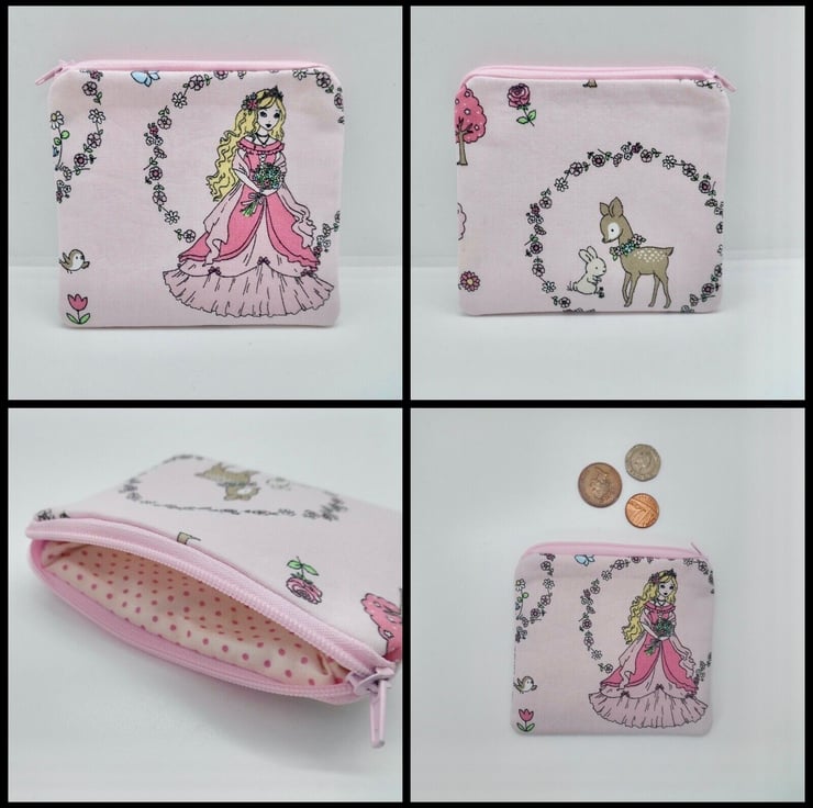 Pink princess. Lined with pink and white spot. Pink zip. 11cm x 10cm
