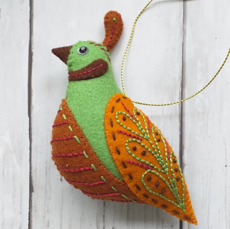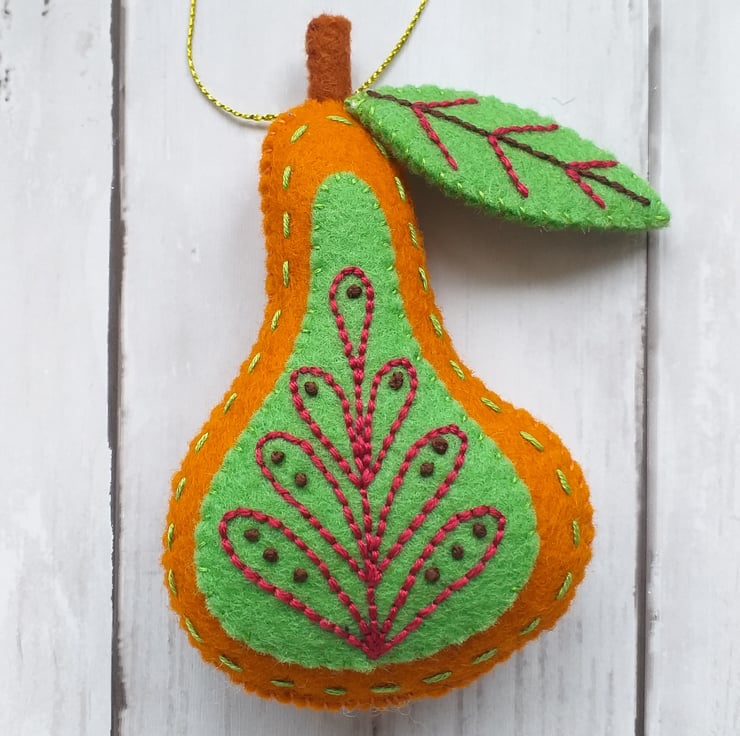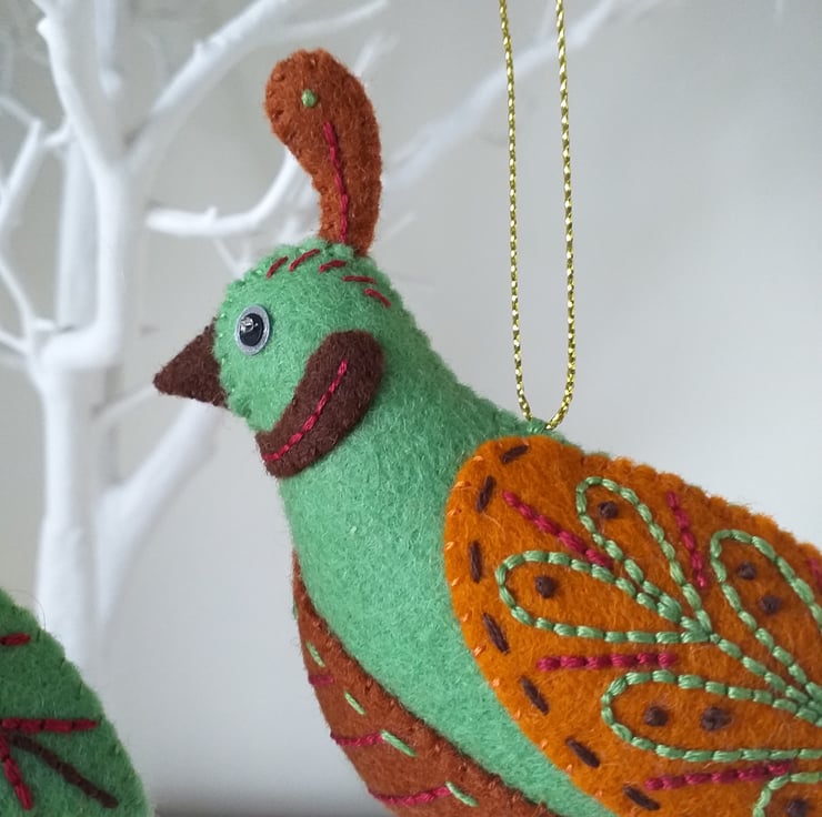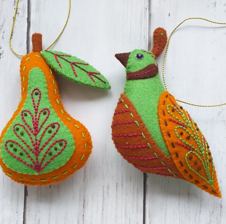 The partridge and pear have been made with 100% wool felt, embellished with complimentary embroidery.