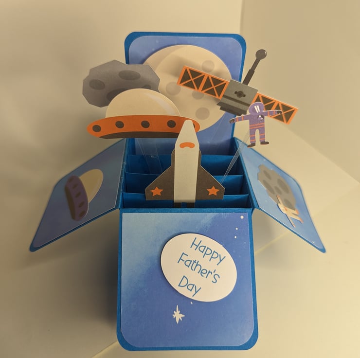 This regular sized box card has a blue base and is decorated with space papers and die cut shapes of spacecraft, astronauts and satellites. There is a blank panel on the back for you to add your own handwritten message or if you prefer, let me know what message you'd like on the back and whether you'd like it written or typed and I can add this at no extra cost.