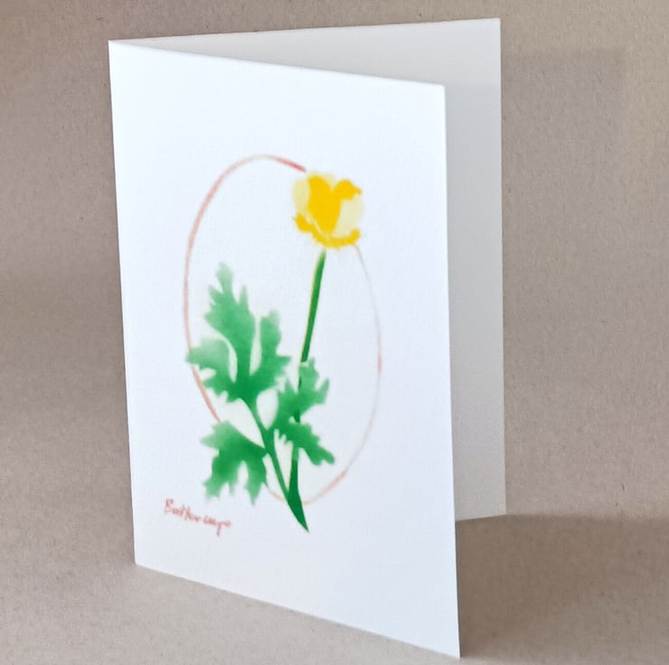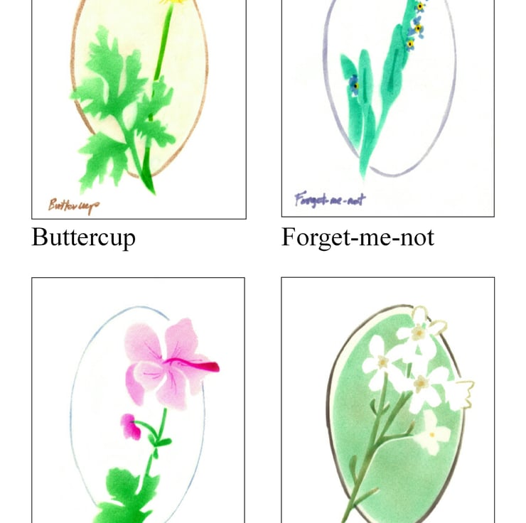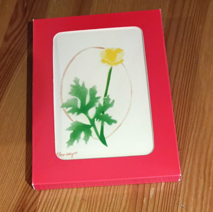 Botanical art cards: Buttercup, Forget-me-not, Pelargonium and Saxifrage. Each handmade flower card is individually wrapped in a clear compostable bag with a paper envelope. Or sold as a gift box of 4 floral cards which are packed in a cardboard card box with a clear window.
